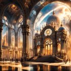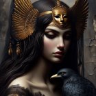 Prompt: A masterpiece of fantasy realism with elements of mystical futurism. A futuristic mechanical skeleton made of silver metal poses against the backdrop of a futuristic nighttime Wall Street. The mechanical skeleton wears a golden crown. In its right hand, holding the handle, it carries a golden metal briefcase.
