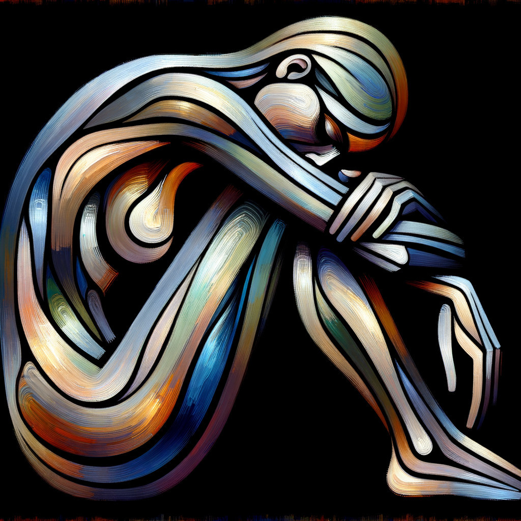 Prompt: Her Sadness kieth henning brush oil on canvas iridescent paint on black background, minimalist female model zen lines abstract brushstroke art, (((sorrowful self-hugging pose))) , abstract depiction includes full abstract head & entire abstract body including arms and legs, all depicted in abstract on the screen, , no nudity, use only iridescent and black colors only