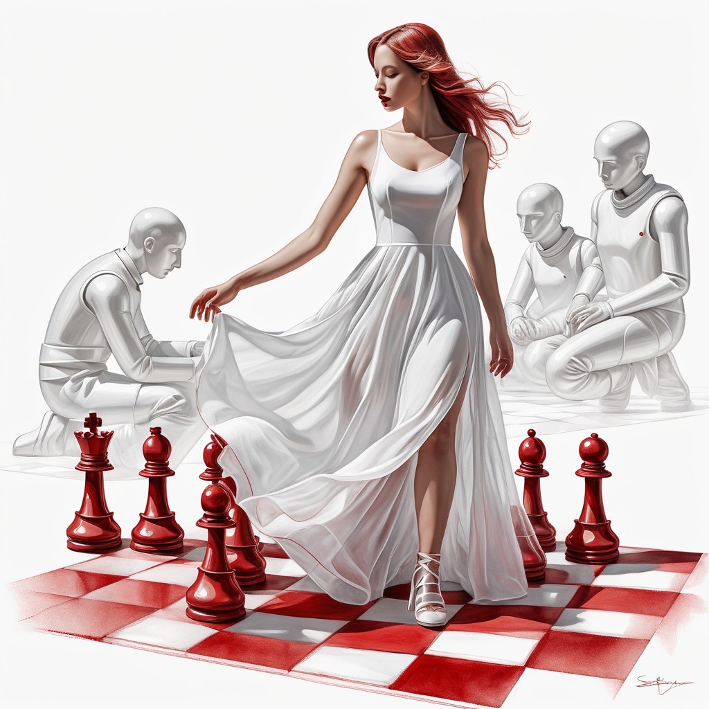 a woman in a white dress and pawns,