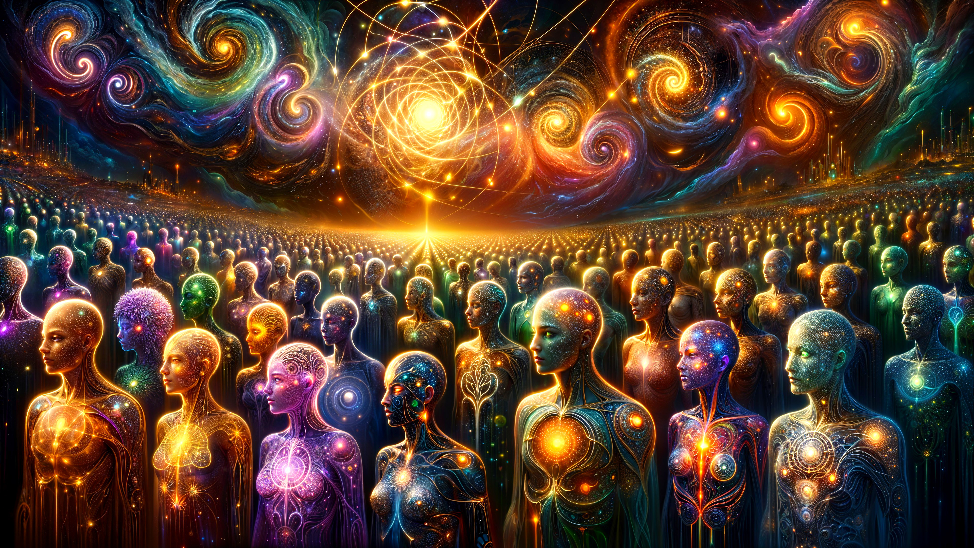 The atmosphere vibrates with the hum of unity—streams of data, light, and emotion flowing through the interconnected beings. Their eyes shimmer with galaxies, and tears of luminous color fall to the reflective surface below, creating ripples that birth new beings of light. Above, the heavens bloom with kaleidoscopic auroras, sacred geometry halos, and orbiting Merkabas radiating rainbow plasma.