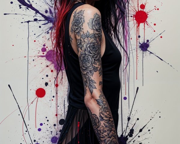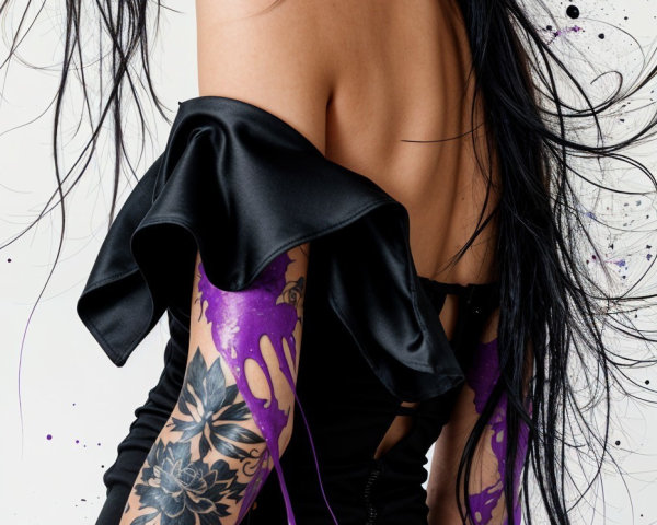 Prompt: Create an image of a fantastical female character with a striking appearance. She has a warm, rich skin tone that suggests a background in a fantasy realm. Her face features intricate, swirling tattoos that add to her mythical allure. Her large, violet eyes are captivating and convey an air of mystery. She has long, dark hair that flows down her shoulders, complementing her overall look.
