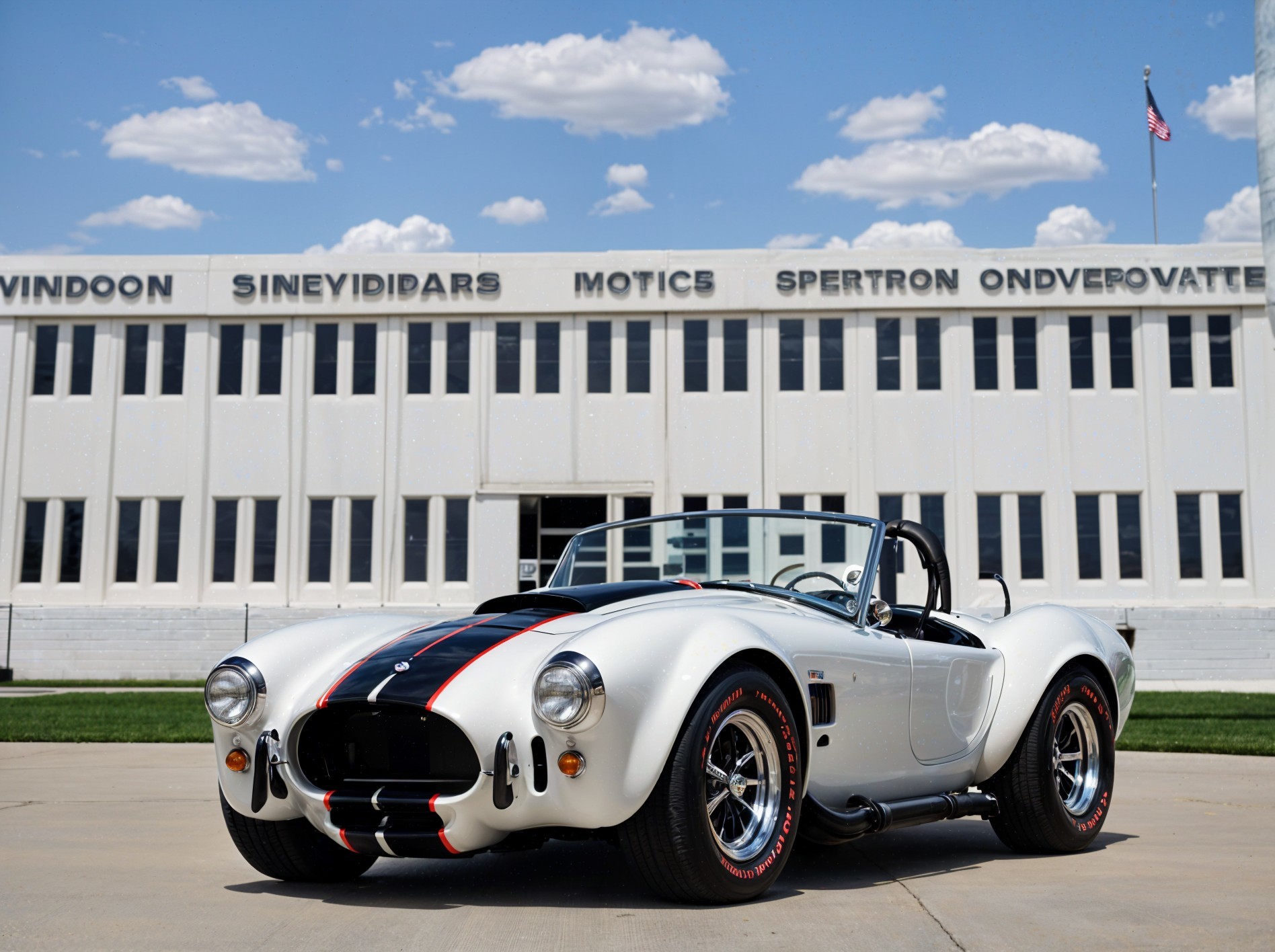 Prompt: 1965 Shelby 427 S/C Cobra "Sanction II", Perfect, painted white glossy paint, thick glossy black racing stripe outlined in glossy red paint up the center of car, glossy black painted hub-caps, black leather interior, convertible, sunny day, parked, in front of the Indianapolis Motor Speedway, Perfect, 32K
