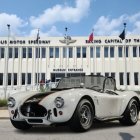 Sleek 1965 Shelby 427 S/C Cobra "Sanction II" Sports Convertible Car in front of Vintage I-Speedway