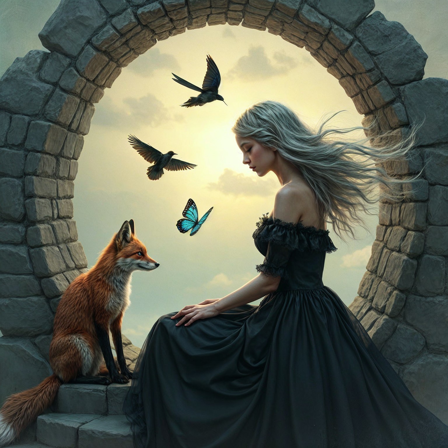 Prompt: A dreamlike, surreal scene featuring a woman with rosy skin and gray mid length wavy hair blowing in the wind, sitting calmly on a stone portal of the kind that connects to other worlds. She wears a total gothic black dress. A fox sits beside her, both looking down pensively. Birds—black, white, and a blue butterfly—fly around them in a poetic movement. The sky is overcast with a soft golden light. The atmosphere is whimsical and melancholic, with a painterly, storybook-like quality. High levels of detail, fantastical realism, and ethereal lighting.