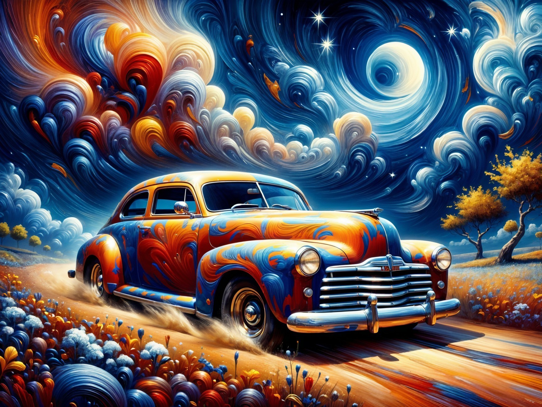 Prompt: A vibrant custom classic car painted in blue and red with a white star, featuring a powerful engine, chrome details, and an American flag. It stands on a dirt road amidst greenery