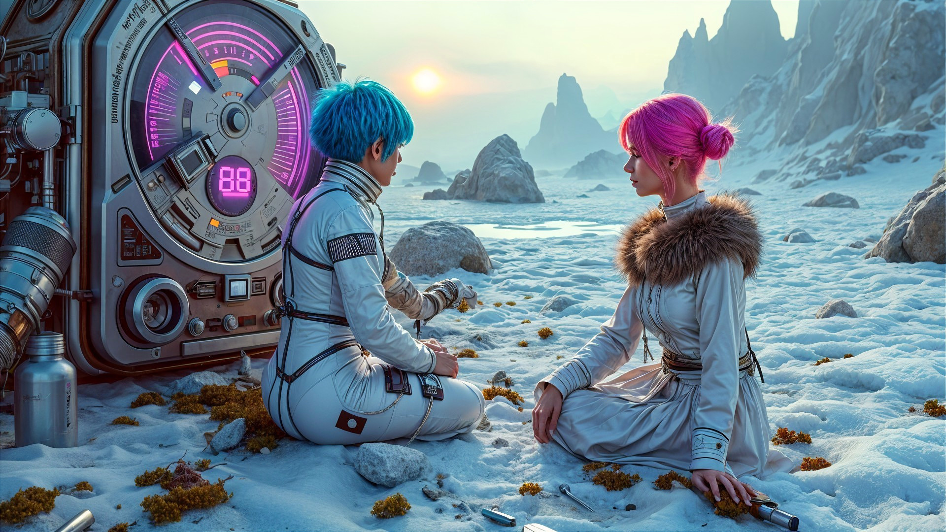 Prompt: On a planet with ice and partially molten lava, two different beauty researcher with vibrant pink and blue hair, Makeupaugmenting are working together. She wears different form-fitting astronaut suits, and one a Victorian-style outdoor dress with fur cape, that accentuates her slender figures. The suit has several cutouts for freedom of movement, and some tools are attached. The researchers working on a large holographic complicated apparatus that is part of a holographic communication system, complete with indicators and displays. Next to her, on the ice and the rocky ground with some moss and old leaves, lie tools and spare parts. The sun illuminates the rising fog in various colors created by the alien atmosphere. There is a lava lake nearby that has melted the ice around it, and behind it are strange mountains and boulders. Photorealistic picture.