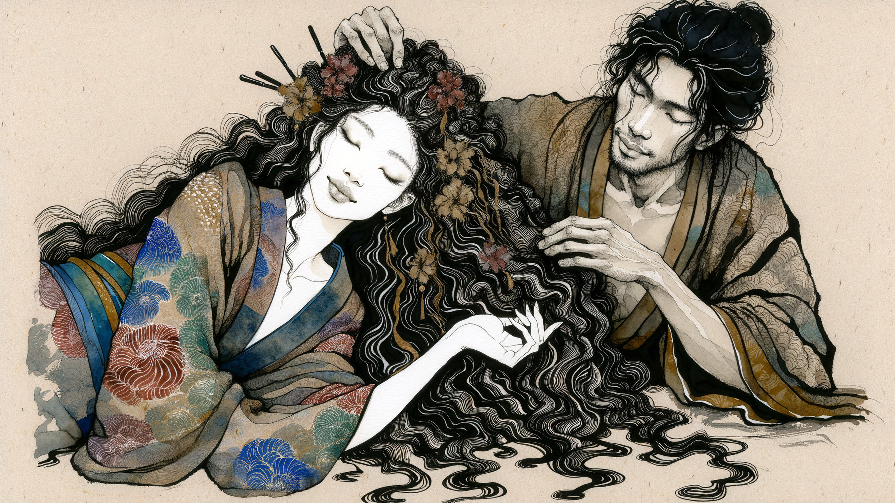 Prompt: Masterpiece, a delicate ink and watercolor wash rendering on rough handmade paper. A serene and intimate scene unfolds in a graceful, screen-filling composition, exuding a warm and tranquil atmosphere. A man and a woman lie closely together, their forms rendered with soft, expressive ink lines and layered washes of muted color. The woman's long, flowing hair cascades around them like a delicate river, each strand defined by intricate, fine ink work. Ornamental flowers are woven through her tresses, suggested by tiny, precise strokes of crimson, indigo, and gold. Her delicate features are peaceful, eyes closed in rest, her face a study in serene elegance. She is dressed in a richly patterned kimono, its designs evoked not by bold lines, but by subtle, rhythmic textures and washes of deep blue and earthy green. The man, with a calm expression, rests his head gently against hers. His form is captured with relaxed, flowing strokes, his hand tenderly holding a lock of her hair, the gesture rendered with exquisite, ultra-detailed precision. The background is a cozy, inviting space, hinted at with minimalist lines a low table with a simple vase, the soft folds of a futon, and the gentle suggestion of a screen partition. The entire composition is a harmony of warm, rich colors that bleed softly into one another ochre, rose, moss green, and indigo—creating a sense of deep peace and affectionate closeness. The mood is intimate, elegant, and full of quiet character, celebrating the beautiful, unspoken bond between two souls in a moment of perfect tranquility. whimsical, vibrant, cozy, intricate, elegant, award-winning, ultra-detailed, high definition, crisp quality, watercolor, ink, rich colors, graceful, screen-filling, atmospheric.