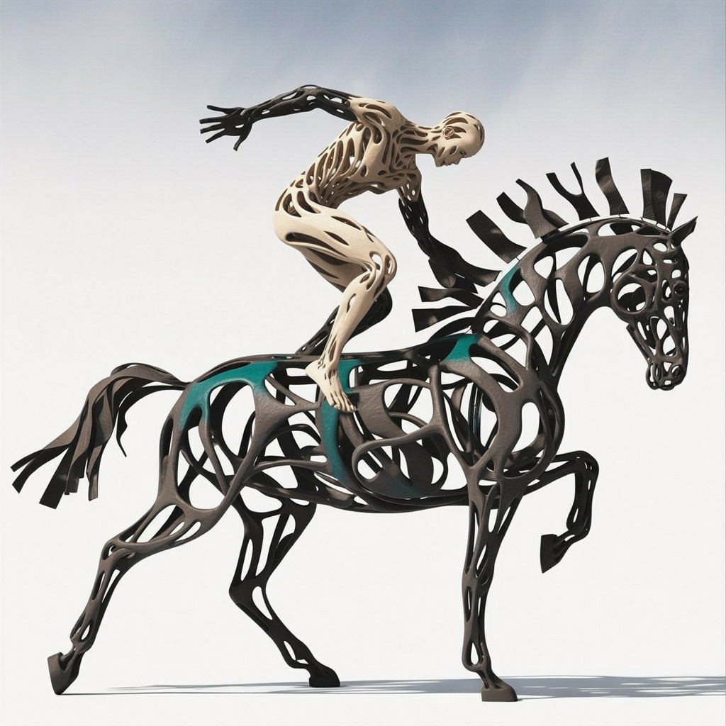 Prompt: A 3D render of an abstract figure, seemingly human on the horse, composed of numerous intertwined lines and particles. These lines and particles are multicolored, with a predominant hue of beige. The figure appears to be in a dynamic pose, body leaning backward. The background is a muted shade of blue, which contrasts with the vibrant colors of the figure. The overall impression is one of movement and energy,Eerie forest setting, dense fog, full moon casting shadows, ancient graveyard, spooky atmosphere, vintage lantern, old gravestones, skeletal horse, tattered cloak flowing in the wind, dark silhouette of a headless rider, misty surroundings, autumn leaves on the ground, haunting vibe, digital painting, detailed textures, dark color palette with hints of deep blues and purples, moonlit scene, mysterious and chilling ambiance, ArtStation.