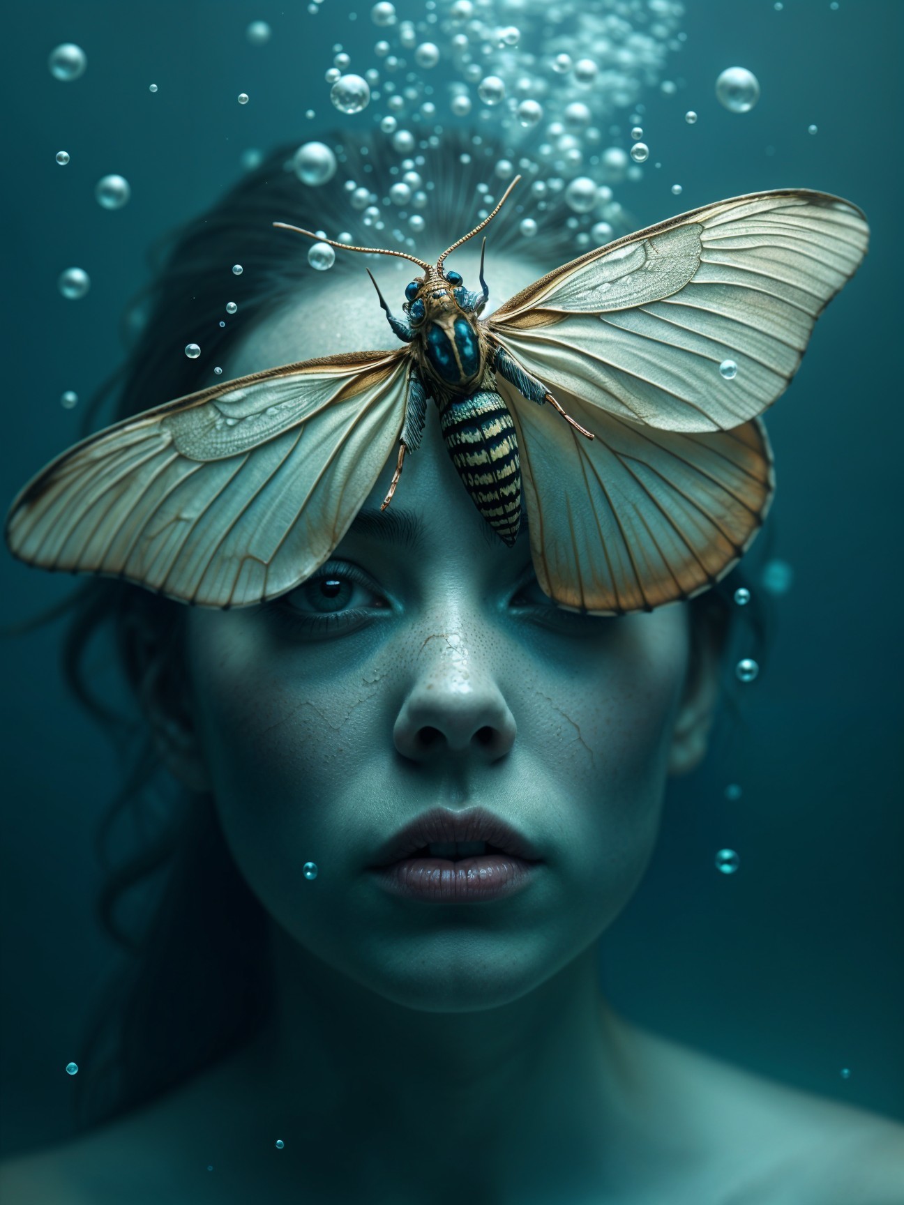 Prompt: A surreal underwater portrait of a mysterious human face partially obscured by a large, ethereal moth resting on the forehead like a crown. The scene is bathed in deep blue tones, with delicate bubbles rising around the face, evoking a dreamlike, otherworldly atmosphere. The moth has intricately detailed wings with soft textures and natural patterns, blending into the aquatic background. The skin of the face appears porcelain-smooth, faintly cracked like aged paint or stone. The expression is serene, melancholic, and timeless. Soft light filters from above the water, creating shimmering highlights and mystical reflections. High-resolution, hyper-realistic, dark fantasy aesthetic, inspired by the works of surreal digital artists and modern gothic photography