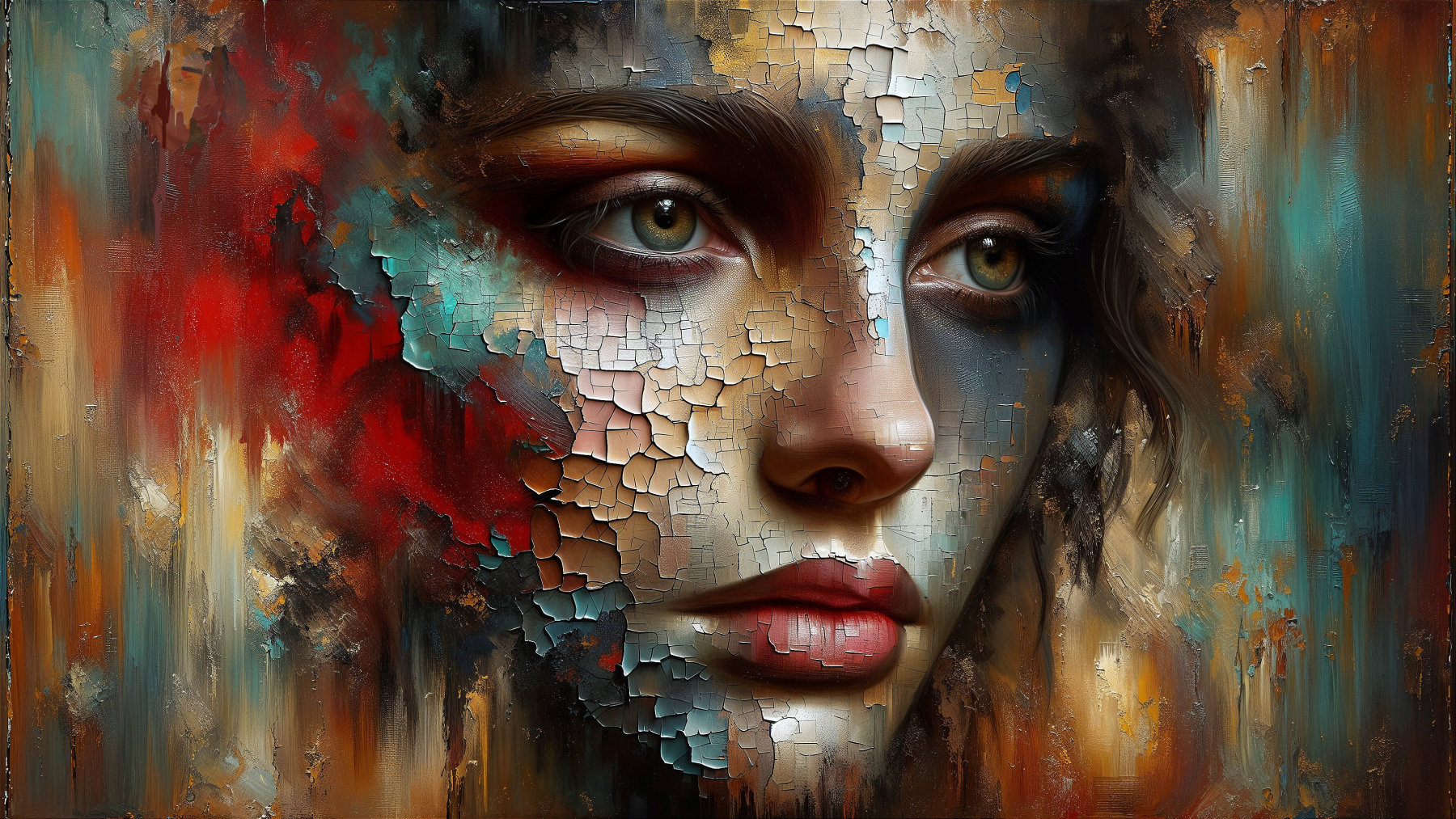 Prompt: Imagine being drawn into 3/4 view a cracked oil painting, a beautiful realistic cracked face woman (an unnerving, ominous, powerful, raw, semi-abstract, horrific, award-winning composition depicting the facial profile of a neutral face trying to hide the sadness and desperation but uncappable of keeping the appearance of normality), where deep reds, turquoise Indian yellow, blacks, and grey hues weave together in a mesmerizing dance. The style evokes the emotional intensity of Michael Garmash, the architectural elegance of Thomas Wells Schaller, the vibrant strokes of Leonid Afremov, and the serene realism of Greg Olsen. This composition embraces natural dark tones, creating a moody yet captivating atmosphere that balances raw texture with intricate artistry. A scene that feels both timeless and deeply evocative, inviting the viewer to lose themselves within its layered beauty.