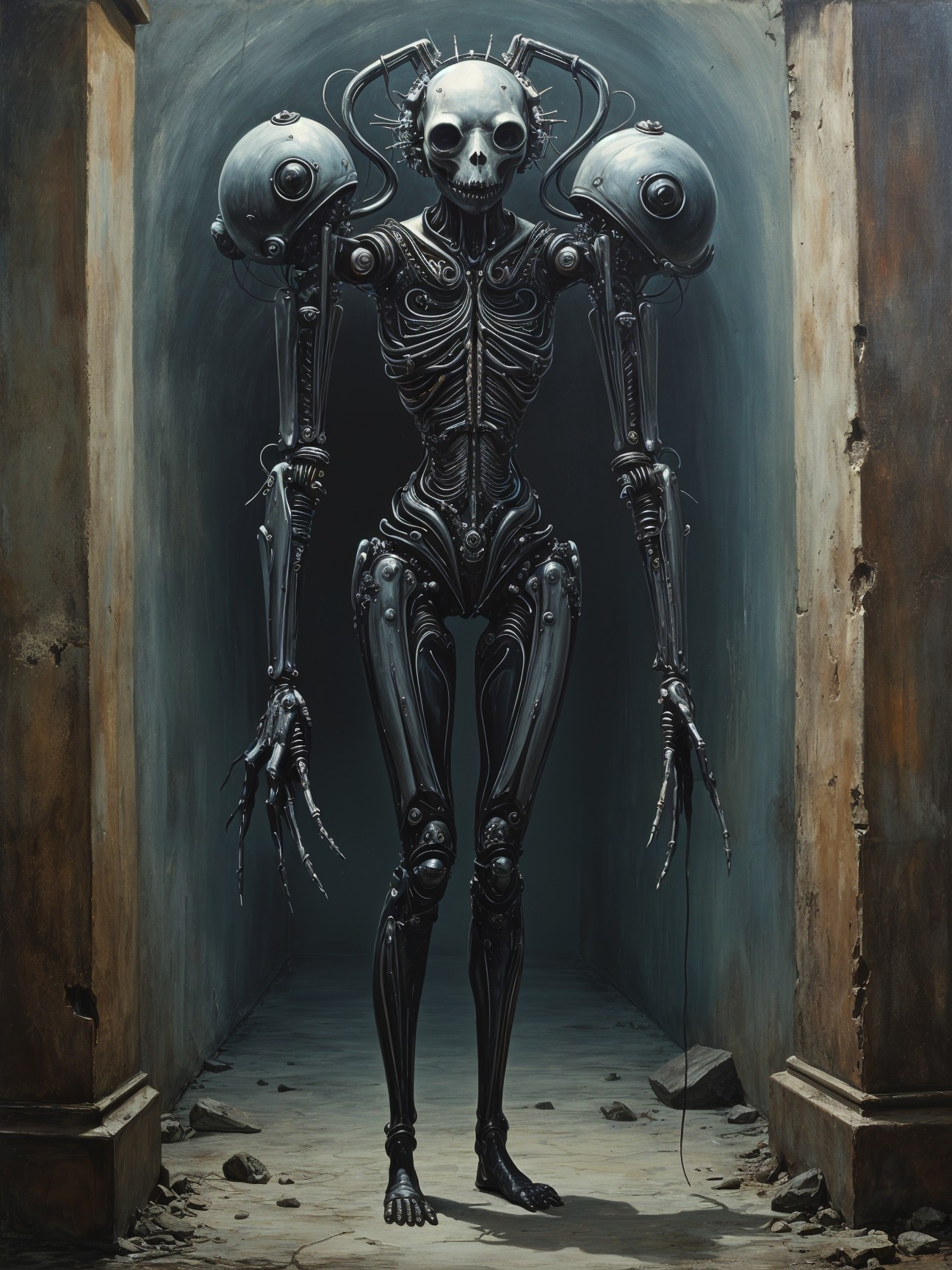 Prompt: A woman, dressed in dark, tattered clothing, stands centrally, surrounded by an organic, dark-hued background, with pronounced texture, visible brushstrokes, and multi-layered tones, in a style blending abstract realism and expressionism, reminiscent of Hans Ruedi Giger, with muted, faded colors, fine grain, and a sense of depth achieved through varying densities of gestural brushstrokes, under a diffused, cool light source.