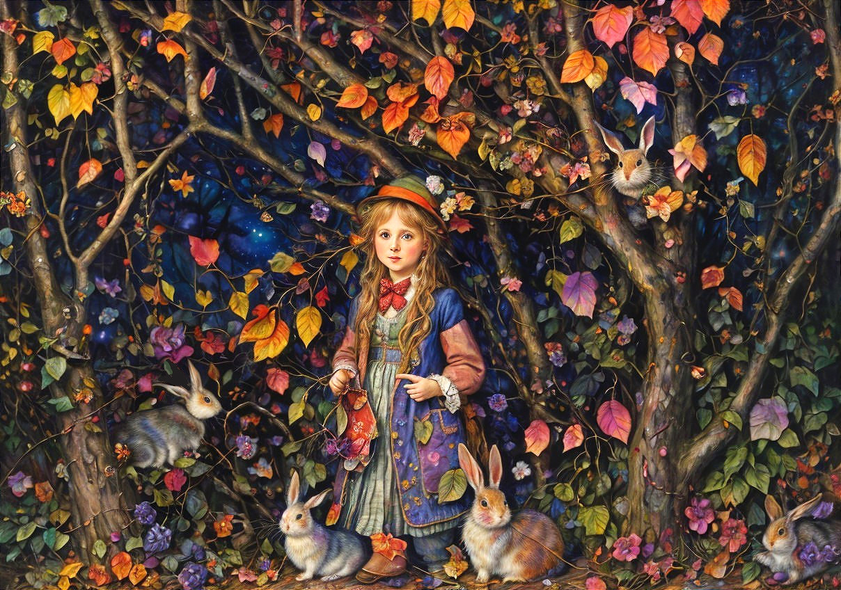 Prompt: Patchwork by Beatrix Potter and Josephine Wall. Nighttime atmosphere, leaves are flying in the wind, brightly shining, multicolored, gnarled, twisted and wound branches and twigs are hanging down from above, in a strange environment full of colorful candy wrappers stands a cute little girl with rabbits