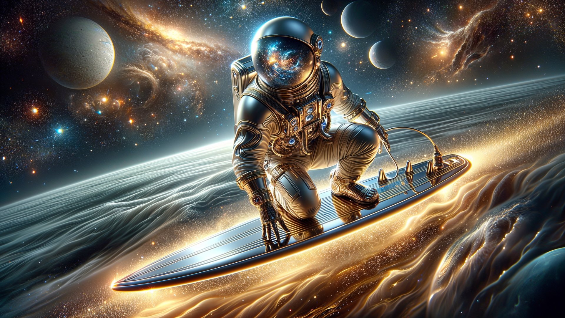 Prompt: A masterpiece of fantasy realism. An astronaut in a silver, ultra-futuristic spacesuit and transparent helmet glides through outer space on a futuristic space surfboard. A hazy golden glow is visible around the surfboard. The astronaut is in a surfer's pose. A picturesque space landscape. A dynamic scene. High level of detail. High-quality lighting and reflections.