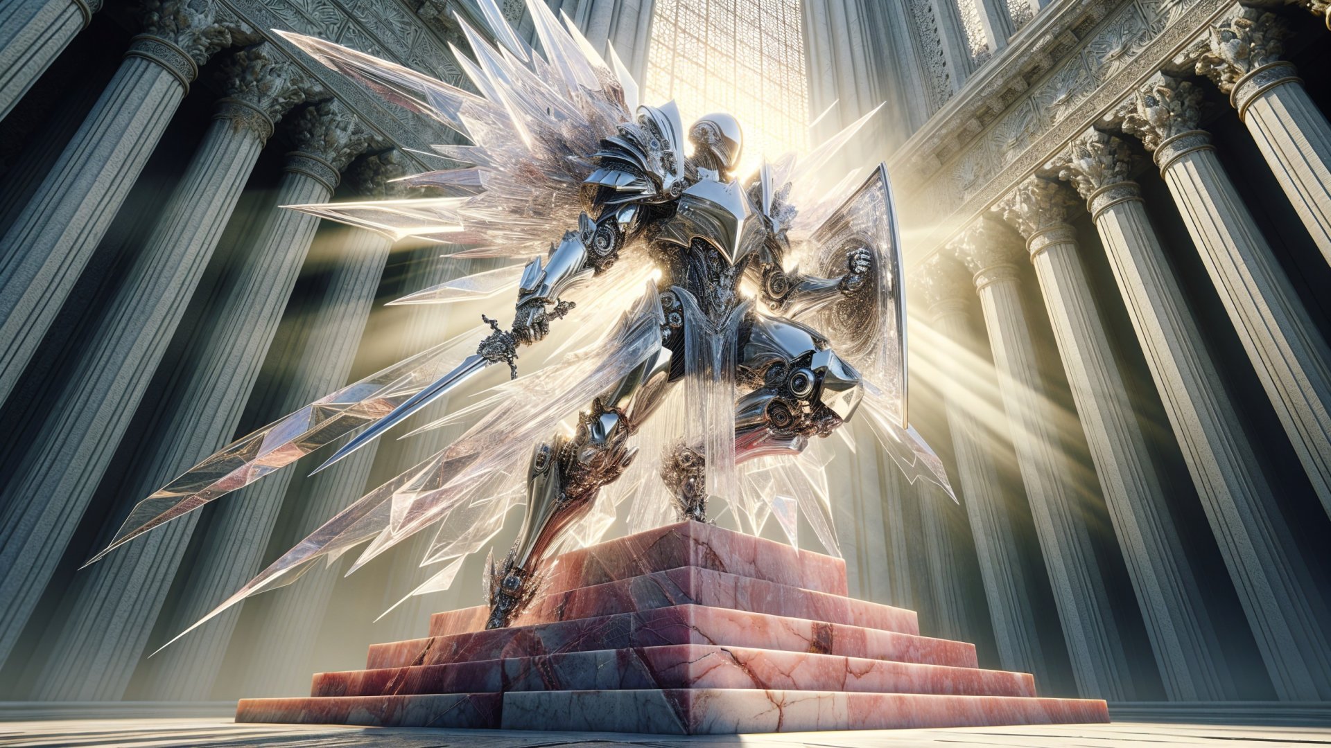 Prompt: A masterpiece of fantasy realism with elements of mystical cyberpunk. Close-up. A cyber-mechanical silver knight in transparent glass armor stands on a pink marble pedestal on top of a huge isosceles pyramid of white stone. The light of the sun illuminating the knight from behind is refracted on the surfaces of his glass armor, creating multi-colored highlights that form a halo of light around the knight's figure. High quality lighting and graphic display of light refraction.