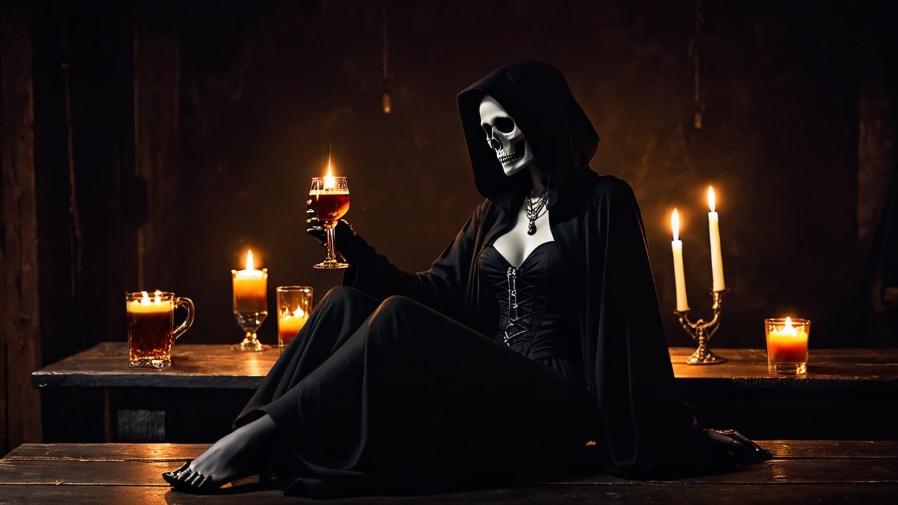 Prompt: A female version of the Grim Reaper sitting on a bar in a dark room having a drink of whiskey with the bottle nearby there is a single candle burning