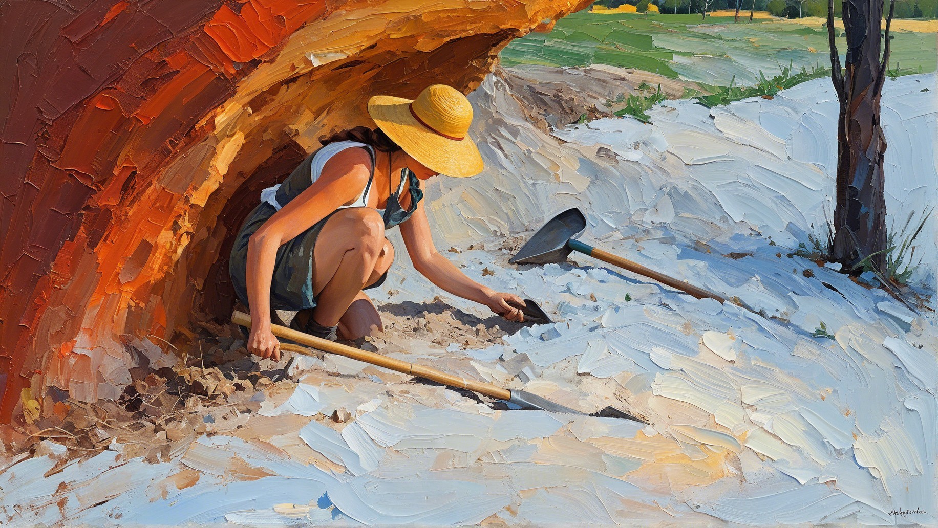 Prompt: Create an abstract art noveau, conceptual style painting, with some impressionism traces, of an outdoor scene of a farmer woman trying to cave deeper into the ground with a hoe, in the middle of a field. Use strong impasto and brush strokes, precise contours, complex layers and ragged textures, luminous palette.