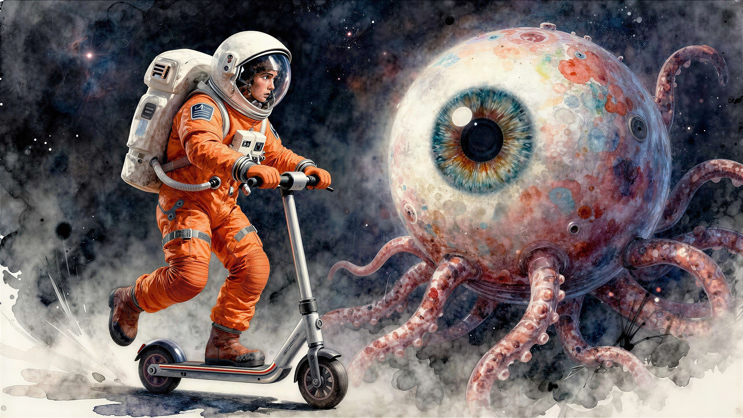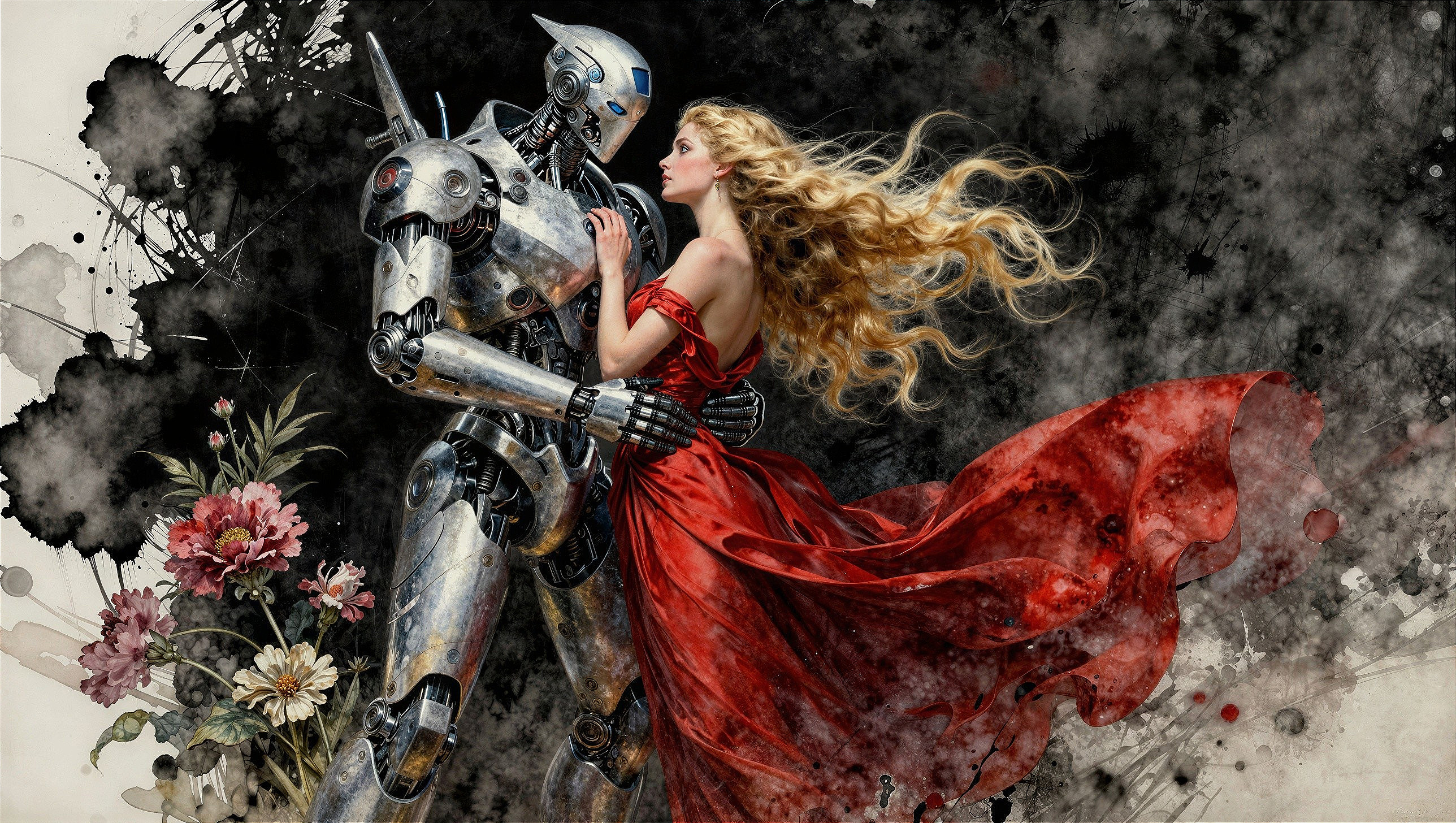 Style: Krinichka Aesthetic, acrylic and ink textures, dripping black ink, splashes of red and blue, watercolor luminosity, cinematic lighting, ultra-detailed,