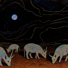 The background above her arms is an subtle explosion of abstract natural patterns and of richness but muted colors, creating an immersive, dreamlike and reverent atmosphere inspired by Jackson Pollock and Takato Yamamoto; below her arms and behind her then inspired by Julia Mehretu and Frank Franzetta , executed with the texture of oil paintings on paper, evoking the expressivity of Yossi Kotler.