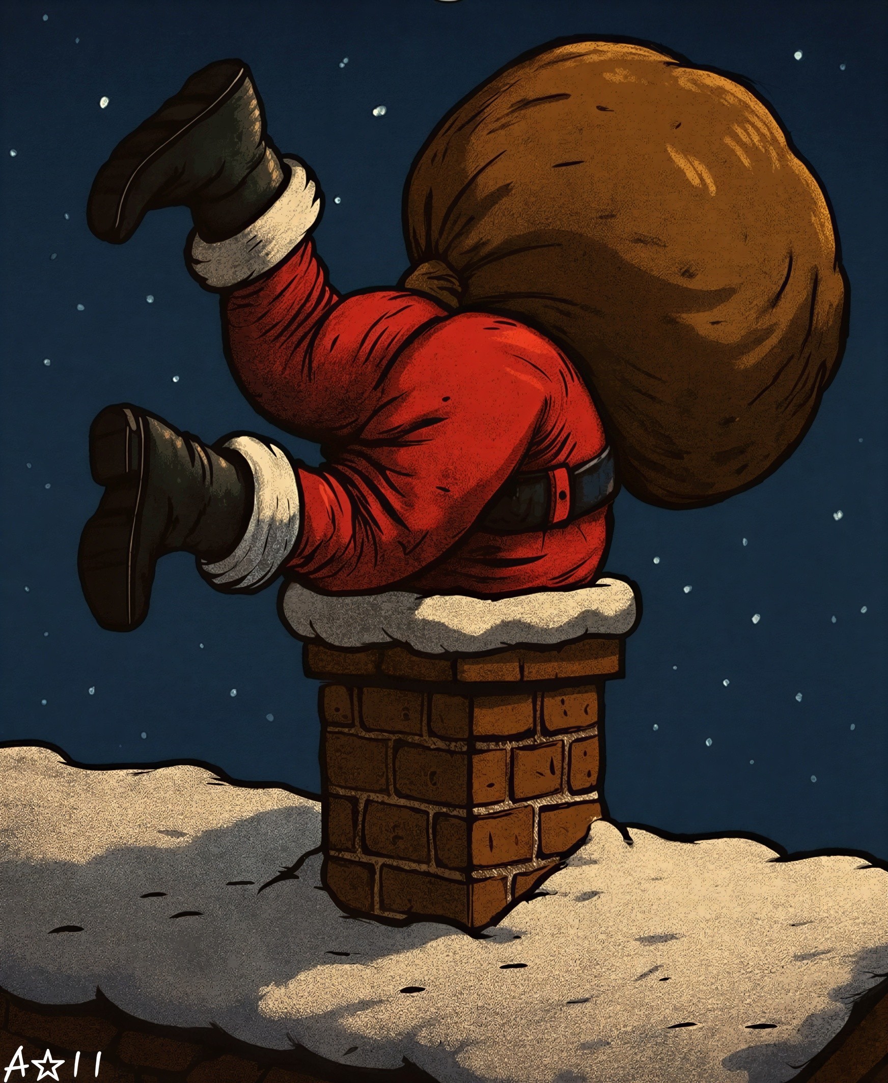 Prompt: Please draw an adorable little santa gnome wearing a cute little green snowflake sweater riding a bright red tricycle. The small santa gnome is riding a bright red sled through the middle of a quaint little snowy town that has a sign reading THE NORTH POLE. The town is fully decorated for Christmas with colorful bright lights, gold stars, red, green, and blue ornaments, silver tinsel, and pink and purple garland. A full moon and many bright twinkling stars illuminate the night sky. Heartwarming, Merry Christmas vibe.