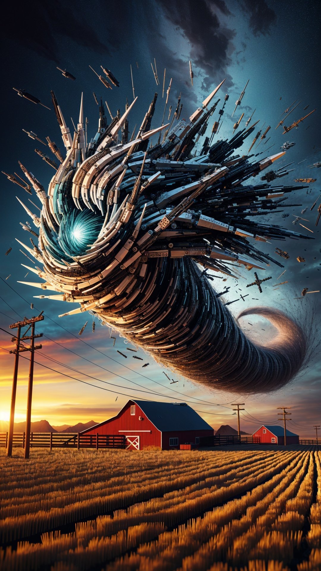 Prompt: Chaotic ferocious lego parts sharp cyclone in formation of long tousled hair beautiful female over an Arizona farm, swirling winds, structure formation in cyclone like in "Transformers film series", menacing appearance, plastic lego sheen, jagged edges, piercing nails protruding, sunset and ominous atmosphere, dramatic lighting casting shadows, high resolution for intricate details, a touch of surrealism, industrial color palette of 7 main rainbow colours, by Digirobson and ANjomestre. Leonid Afremov style ending.