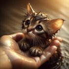 Prompt: Create an image of a majestic Maine Coon cat, seated elegantly on a textured surface. The cat has a thick, fluffy coat with a blend of brown, black, and cream stripes. Its fur should appear soft and voluminous, with a striking ruff around its neck. The cat's eyes are large and bright green, radiating intelligence and curiosity, while its face displays prominent cheekbones and a slightly triangular shape.