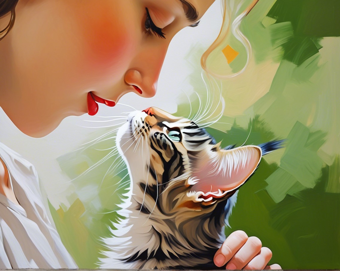 Prompt: Girl and Maine Coon cat meet face to face and nose to nose. Create an abstract oil painting by Matisse and Egon Schiele, depicting the face of a Maine Coon Cat and the face of a young girl in the style of Egon Schiele, facing each other, nose to nose.