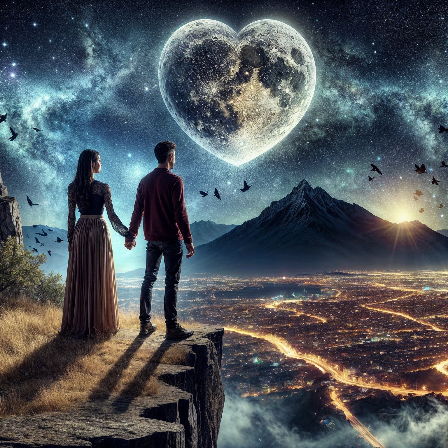 Prompt: young couple holding hands, they are standing on the edge of a cliff lookingout over a city at night, a a mountain in the background, a full moon in the shape of a heart, stary sky