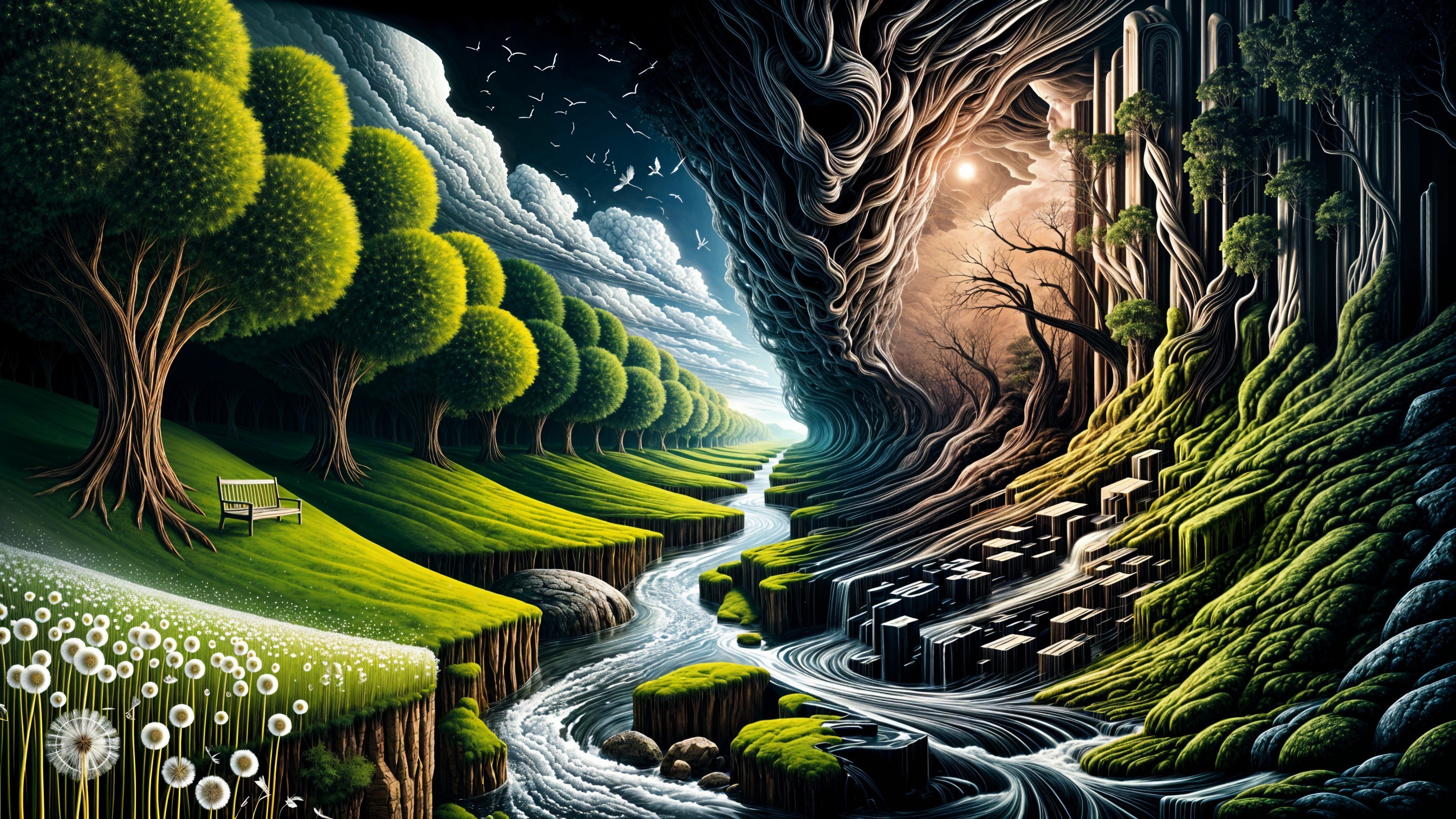Prompt: Intensely emotional creepy abstract landscape with a seamless transformation from overly curated creepily natural beauty to a surreal &oppressive nightmare. Left side features overly nauseatingly serene, nostalgic core of nature, with lush rolling hills, crystal-clear streams flowing over softly eroded agate stones, & dandelion wisps drifting peacefully. Imagery evokes a sense of false safety, alarmingly subtle unreal beauty. As scene progresses horizontally, a gradual, seamless transformation unfolds. Natural landscape begins to subtly distort, introducing elements inspired by M.C. Escher: streams start forming impossible loops, & gentle textures morph into angular, surreal geometries. Mid-transition zone scene retains traces of natural beauty but starts blending with ominous elements: trees lose leaves, bark takes on metallic textures, & shadows grow deeper & more esoteric unnatural. Rightmost section fully embraces a nightmarish, oppressive tone. Skies are dark & putrid, terrain is harsh + jagged, composed of barbed wire, razor-sharp rocks, + corrosive industrial materials. Landscape evokes fear, mistrust, blending Escher's optical illusions with cruel, oppressive designs. Marc Quinn, Helice Wen, Tomasz Alen Kopera, J.M.W. Turner, Lucian Freud, Henrik Aarrestad Uldalen, Alberto Burri