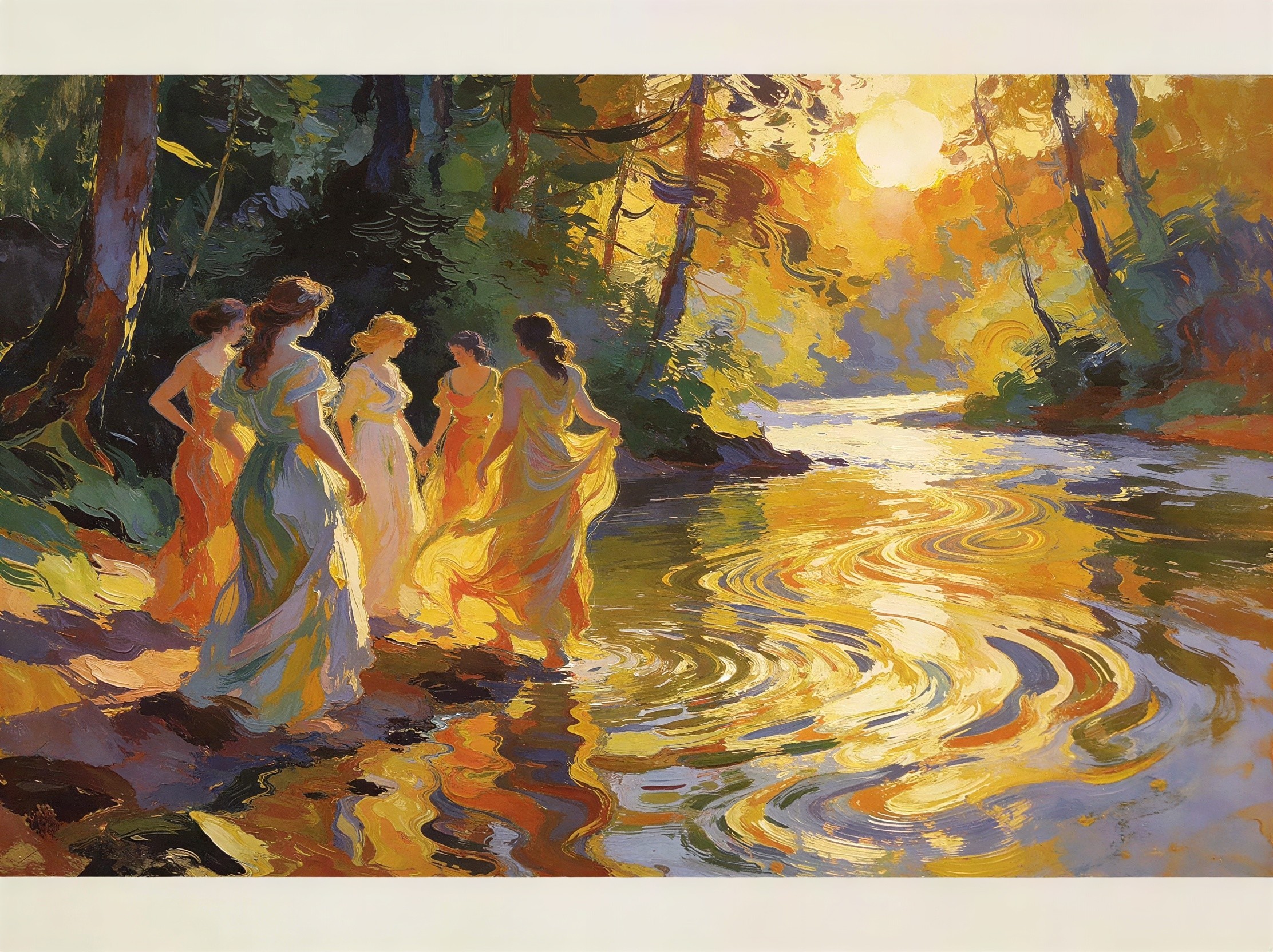 Prompt: Post-impressionism, abstract and fluid brush strokes. Over a stone bridge, a female string quartet play their instruments. The light of the sun traces patterns on the water.