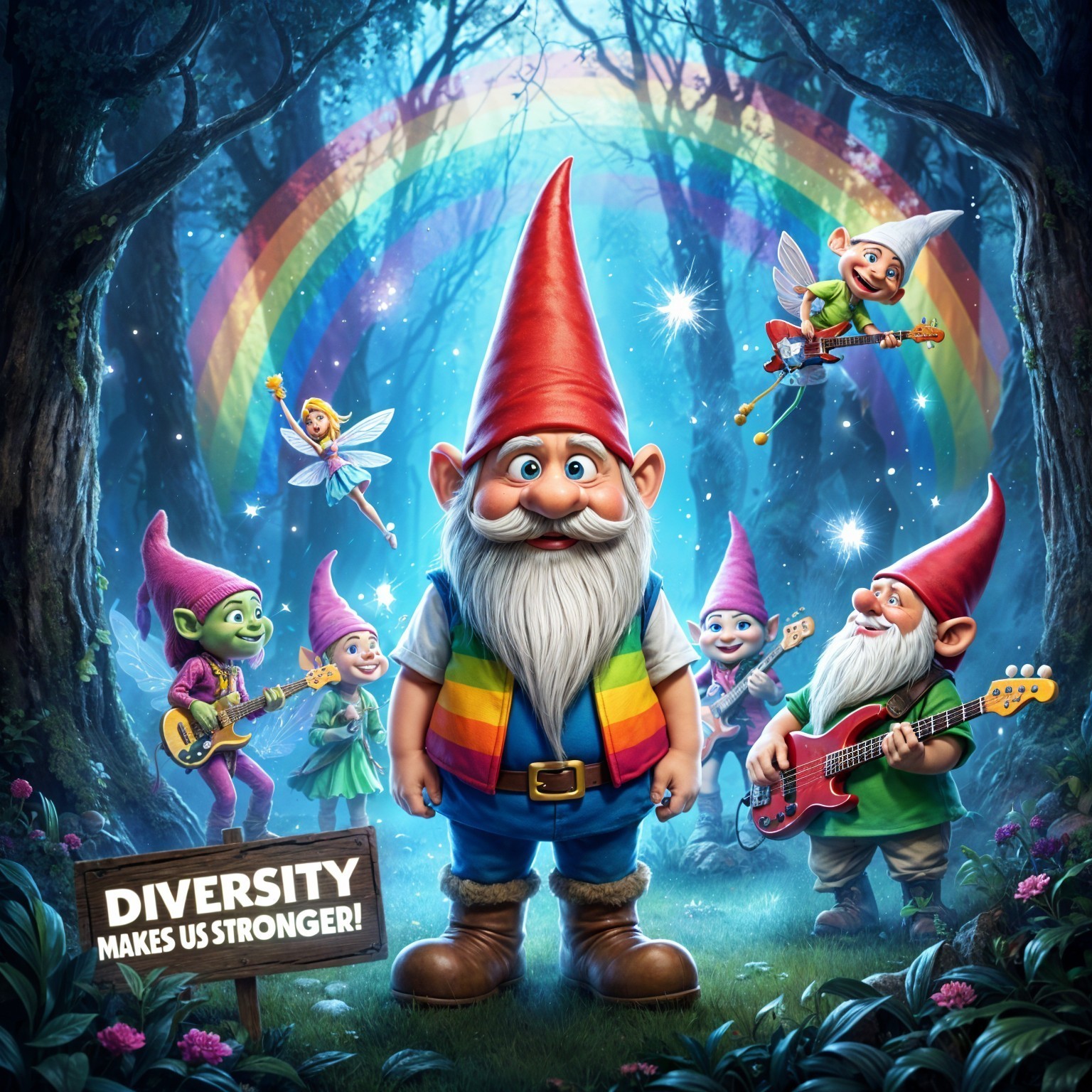 Prompt: A middle aged gnome with a pointed hat stands in a mystical forest. He wears a colorful vest symbolizing unity and respect. His kind eyes shine with the belief that all creatures have value. Beside him, fairies, trolls, and elves play in a rock-band. Magical instuments float in the air, powered by teamwork. A glowing sign nearby reads: "Diversity makes us stronger." The scene is full of warmth, light, and shared purpose.