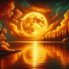 Prompt: Create a stunning landscape painting featuring a bright, oversized full moon in a vibrant orange hue, casting shimmering reflections on a still body of water. The background should consist of dramatic clouds in varying shades of orange and blue, creating a fiery atmosphere. On the left side, depict a slender tree with twisting branches, adorned with bright autumn leaves that mirror the vibrant colors of the sky. In the foreground, include rocky elements at the water's edge, adding texture to the scene. To the right, tall, dark evergreens should rise vertically, contrasting against the fiery sky and adding depth to the composition. The overall mood should evoke a sense of tranquility and awe at the beauty of nature, with a harmonious blend of colors that captures the essence of a breathtaking sunset.