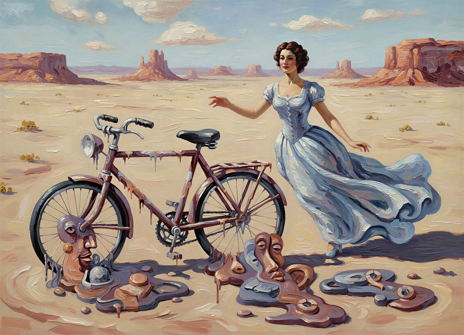 Prompt: Artist Jean-Baptiste Monge style. A pale-beige desert with a trippy melting Picasso-Bicycley. Front view. xHDRi. A traditional painting style reminiscent of Impressionism. 0.5 Neo-Impressionism, Expressionist oil painting, smooth post-impressionist impasto, acrylic, thick layers of colored textured paint, 0.2. Fast painting with broad brush strokes.