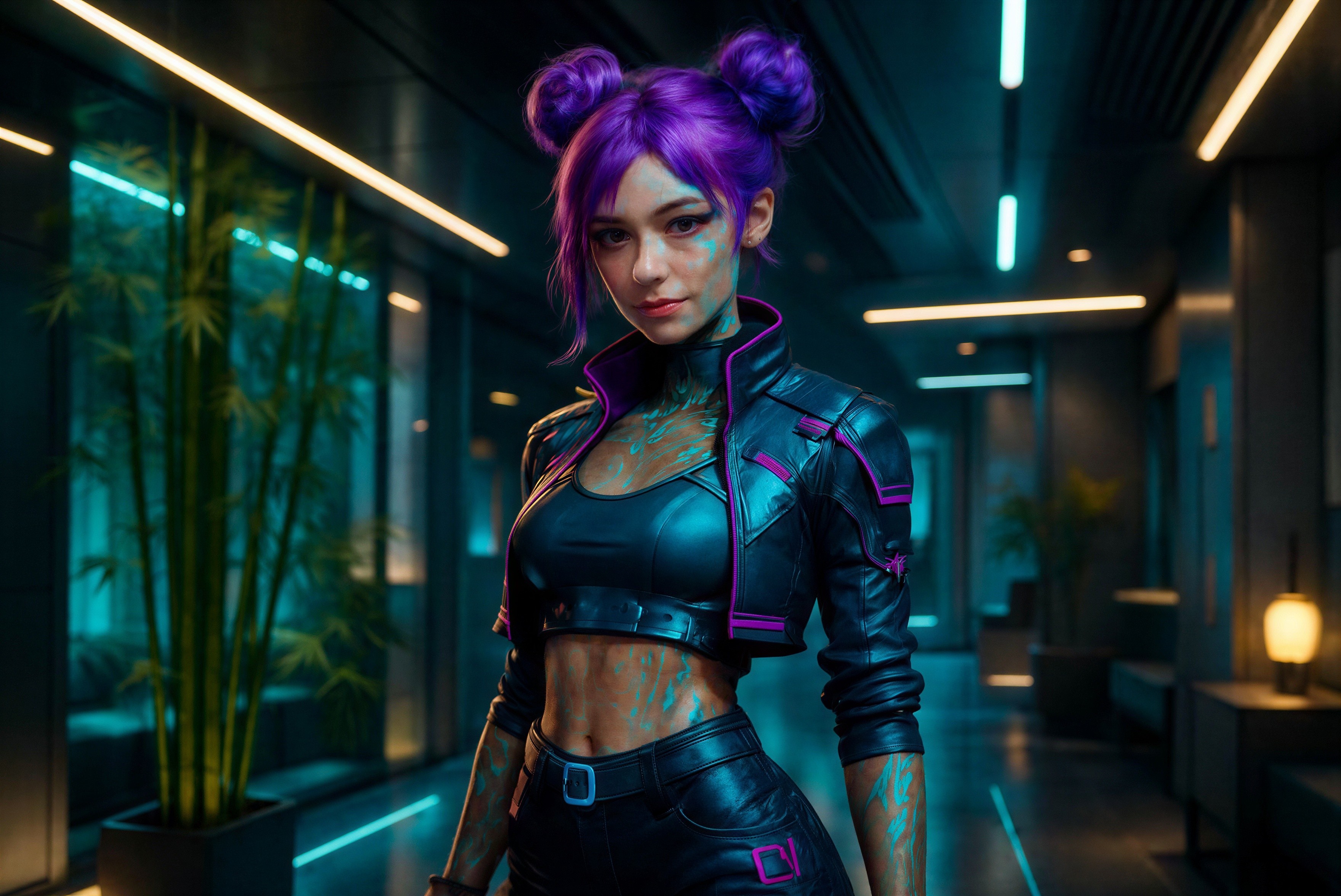 Prompt: A futuristic cyberpunk female character standing in a modern, high-tech interior. She has vibrant purple hair styled in space buns, a unique and stylish outfit with a cropped top and high-waisted shorts that have neon accents and patches. Her skin features intricate patterns, and she has a confident, playful expression. The background includes sleek, artificial lighting, bamboo plants, and contemporary decor, creating an immersive and visually striking environment.