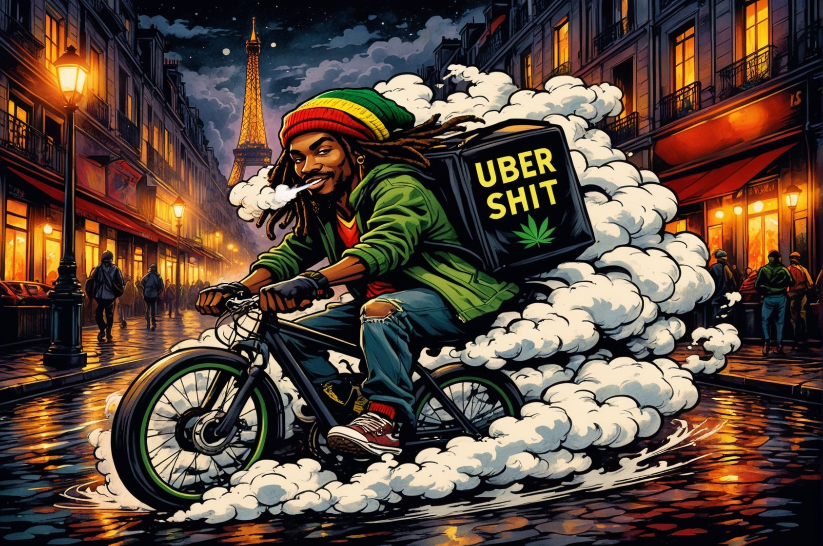 Prompt: A dynamic comic art illustration of a Rastafarian bike courier parody called “Uber Shit”, riding fast through a nocturnal Parisian street. Long dreadlocks flowing, red-yellow-green beanie, relaxed rebellious attitude. He rides a city bicycle wrapped in a thick swirling cloud of smoke, creating a sense of motion. Casual streetwear, worn sneakers, fingerless gloves. A large square delivery backpack with “UBER SHIT” printed on it. Nighttime Paris: wet cobblestone street reflecting neon lights, glowing bistros, street lamps, Haussmann buildings, silhouettes of pedestrians, the Eiffel Tower visible in the background. Cinematic low-angle shot, strong perspective. Comic book / graphic novel style, bold black ink outlines, expressive linework, cel-shading, high contrast lighting, deep shadows, saturated neon colors, gritty urban satire, dynamic motion blur, energetic composition.