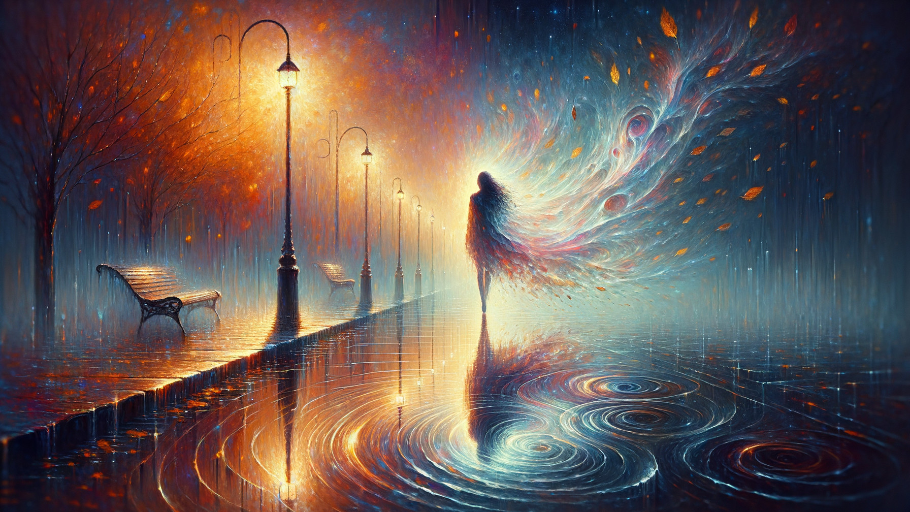 Surreal wet-street composition where reflections form more real than the figure itself. The woman’s silhouette dissolves into shimmering patterns on the ground, each ripple a fragment of memory. Lamps tilt slightly as if bending to watch her pass. The colors melt: copper into indigo, rain into breath. The whole scene feels like dreaming while standing awake. EmmAI dreamy hazy breezy Fragile Vision, reflective abstraction, layered transparency, misted glow, cinematic emotional tone.