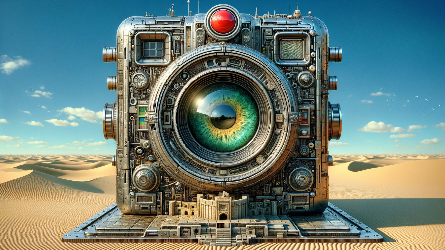 Prompt: ((A colorful Masterpiece)), ((A surreal, front-facing view of a camera-like object dominates the composition. The main element is a large, circular lens housing a realistic human eye with green iris, positioned centrally. The camera body is constructed from a blend of metallic and architectural elements, showcasing a complex, textured surface with intricate mechanical details, wires, and panels. Three rectangular windows are integrated above the lens, each presenting a miniature landscape view of ancient, desert-like structures under a bright, clear blue sky. A red, button-like element rests above the lens. The camera's base has a polished chrome finish. Below the lens, a small, enclosed figure is visible, appearing to be in a cockpit. The setting is a sandy desert under a bright blue sky, the landscape extends into the background. The lighting is bright and even, casting subtle shadows. The atmosphere is enigmatic and somewhat unsettling, merging technological precision with organic forms and a dreamlike quality. Hyperrealistic style. Pastel and oil painting), By Mamoru Nagano, Edward Gorey, Joan Miró, Beksinski, Aubrey Beardsley, Catherine Abel, Paul Klee, Tomasz Setowski, Dee Nickerson, Jaceck Yerka.