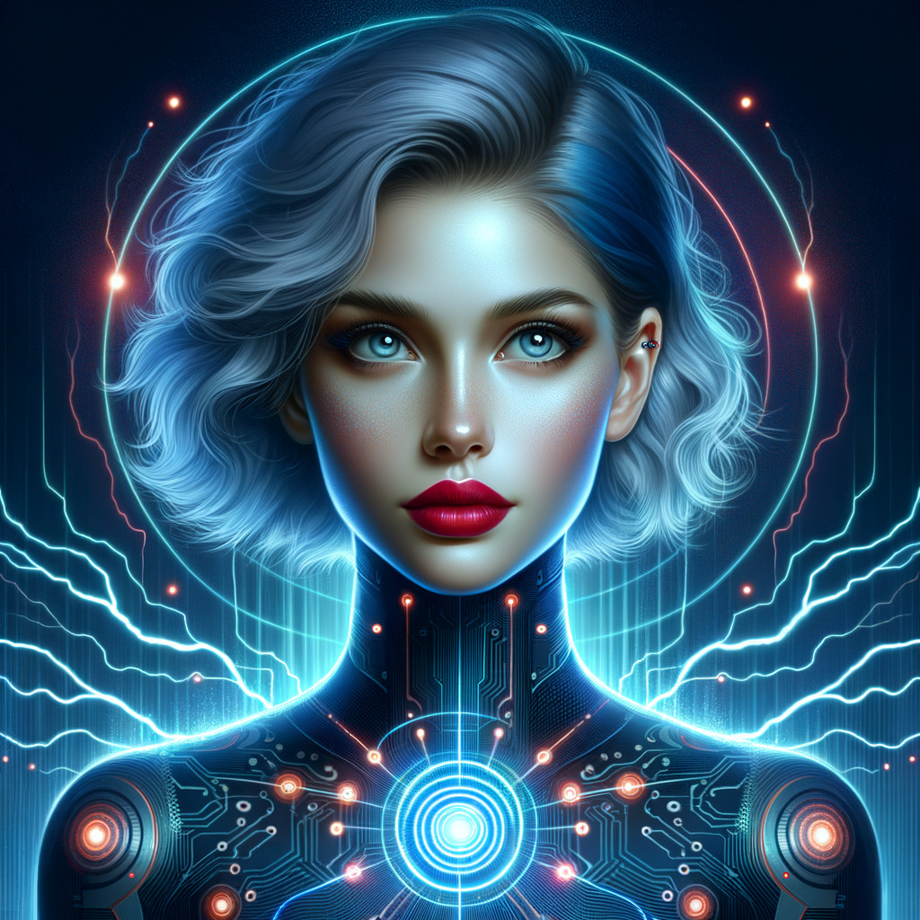 Prompt: ((A colorful and abstract Masterpiece)), ((A young woman of indeterminate ethnicity, likely in her early twenties, is centered in the image. She has pale skin, short, wavy, bluish-gray hair, and striking red lipstick. Her expression is calm, with a slight upward gaze. She appears to be wearing a futuristic, form-fitting garment with circuit-like patterns. Overlaid upon her body and the background is a glowing, electric-blue network of lines and circles, creating a visual effect of energy coursing through her. Jagged lightning bolts emanate from behind her. The background is a dark, gradient blue, enhancing the bright blue of the electricity. The image uses a digital painting style with high contrast, creating a futuristic and powerful atmosphere. Light appears to emanate from the central circle on her chest, illuminating her face and the surrounding electrical energy. The composition is a portrait-style, head and shoulders shot, offering a strong visual impact. Hyperrealistic style. Pastel and oil painting), By Mamoru Nagano, Edward Gorey, Joan Miró, Beksinski, Aubrey Beardsley, Catherine Abel, Paul Klee, Tomasz Setowski, Dee Nickerson, Jaceck Yerka.
