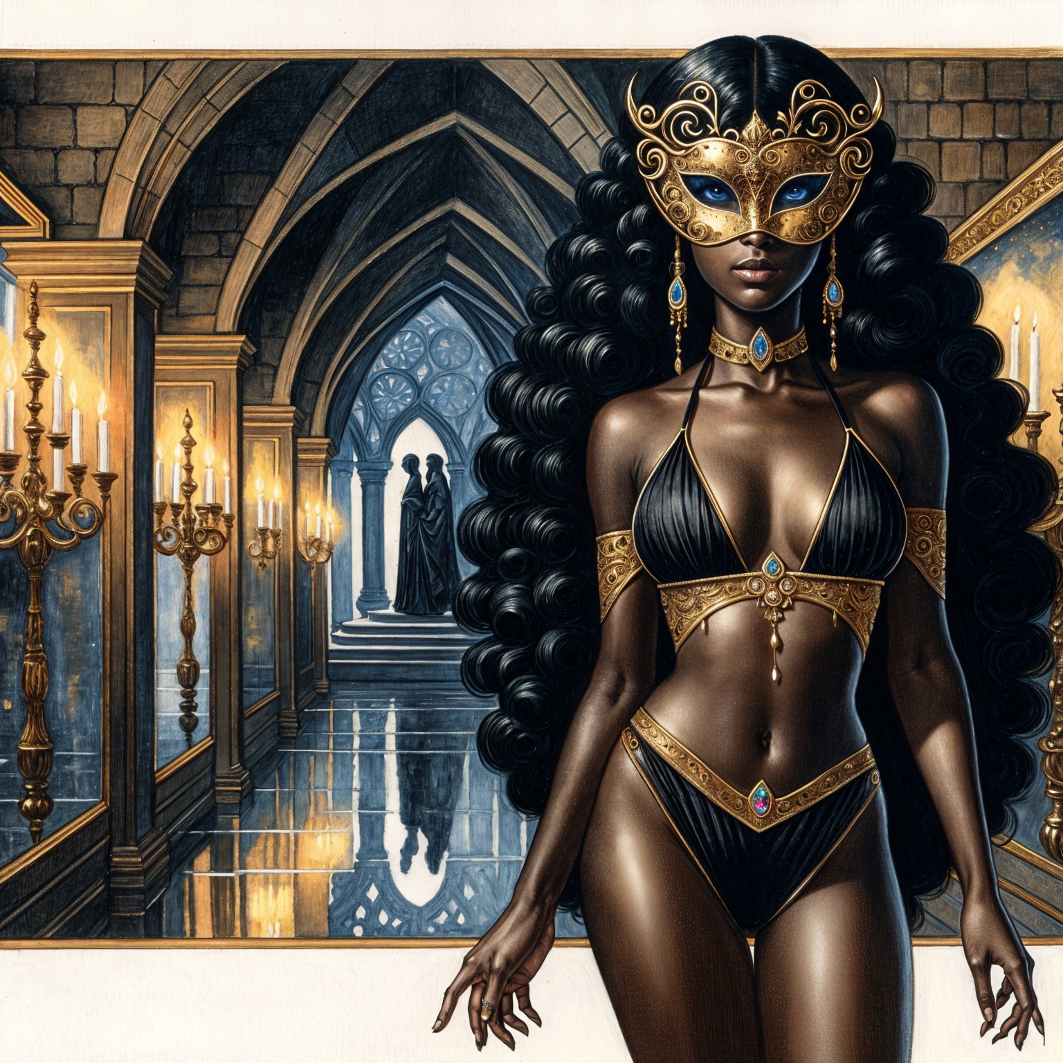 Prompt: A masterpiece of watercolor painting. A girl in a golden bikini and a golden Venetian mask. She has a beautiful, thin, wiry body with a thin waist and wide hips, as well as beautiful, slender arms and legs. She has dark skin and luxurious, long black hair. Beautiful blue eyes are visible through the slits in the mask. The lower half of her face is slender, with beautifully contoured lips. A mysterious smile adorns her lips. Behind her, a hall of a mystical dungeon can be seen, with tall mirrors and wall sconces holding burning candles.