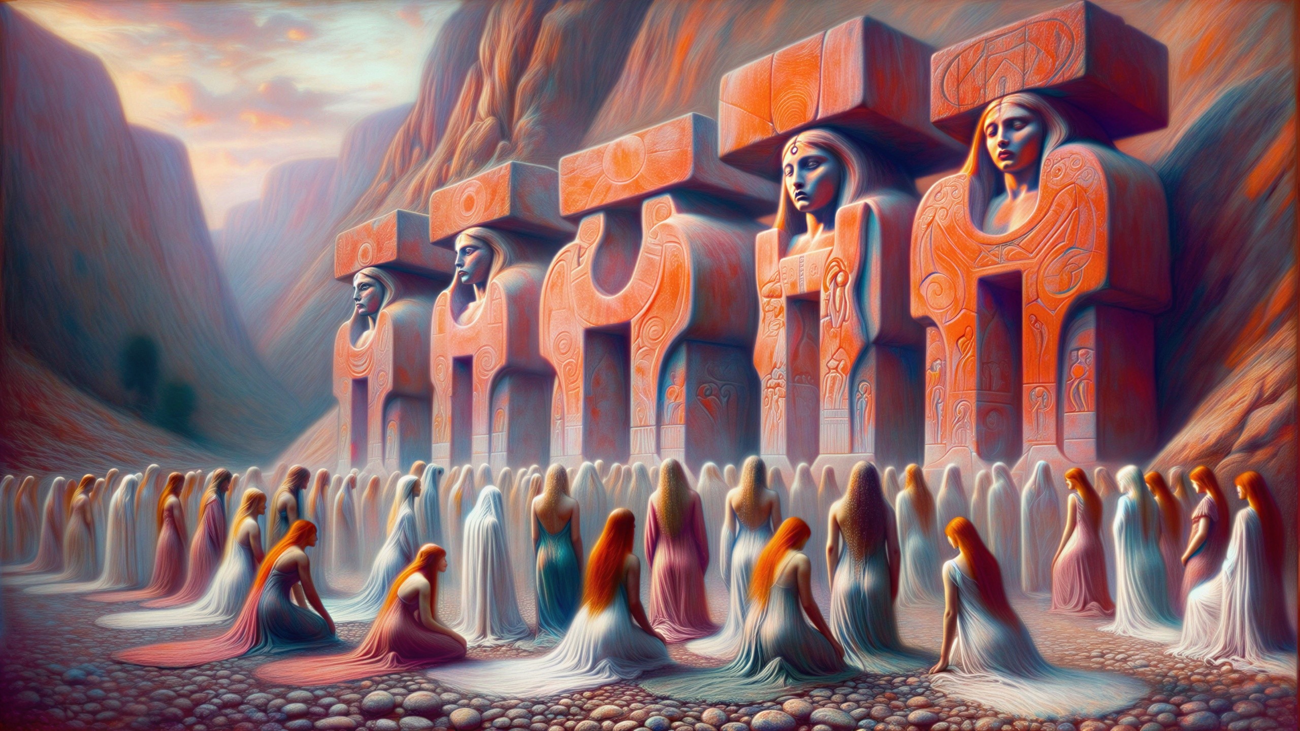 Prompt: A masterpiece of pastel painting. A mystical valley of ancient phallic symbols. Beautiful girls in white robes and with long flowing hair kneel in prayerful poses before enormous ancient stylized phallic symbols carved from red marble.