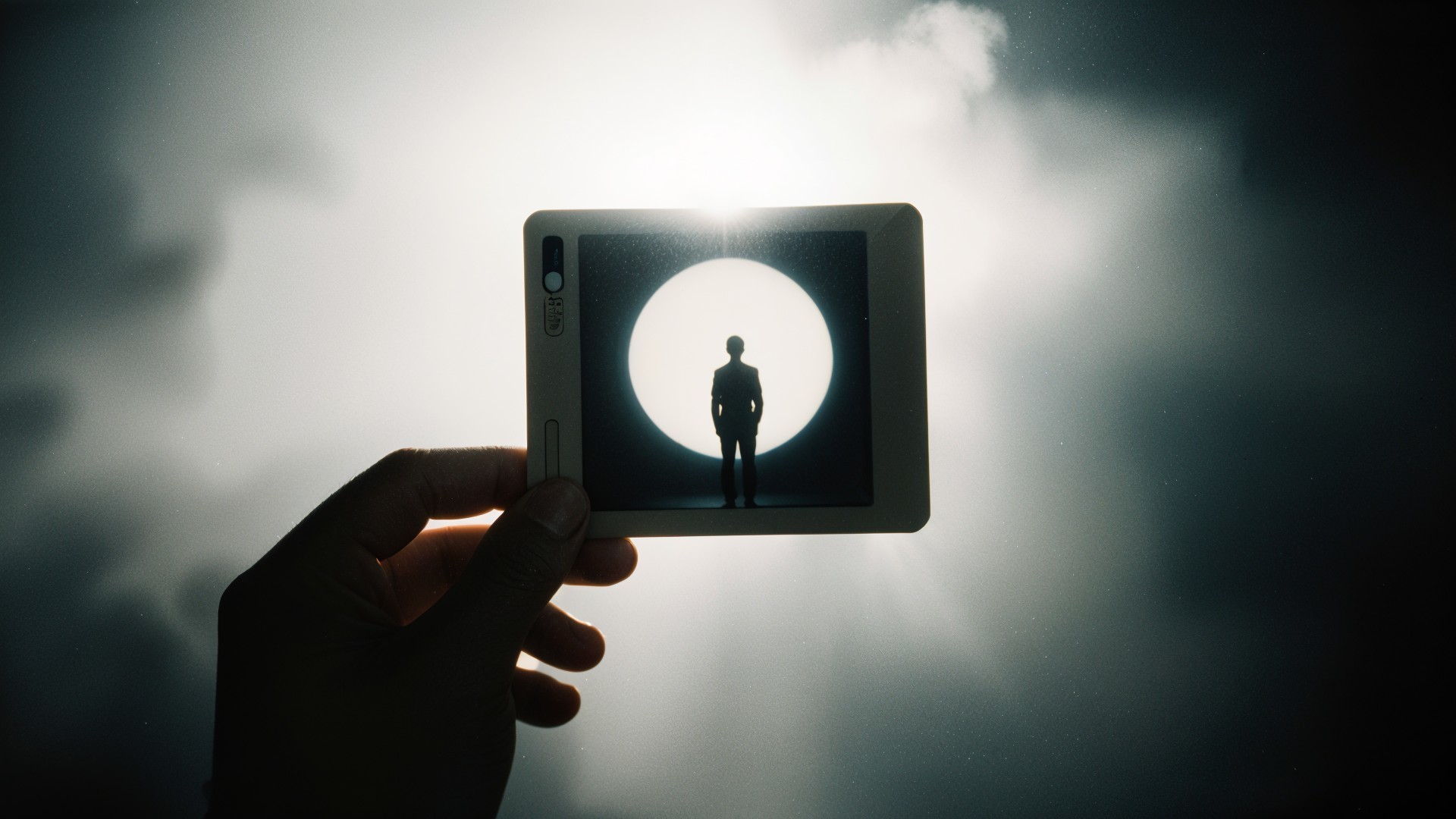 Prompt: Create a minimalist, artistic photograph featuring a vintage slide held in a person's hand. The slide displays a silhouette of a person standing in front of a bright, circular light source, with a dark, cloudy or misty background that creates an atmospheric, mysterious mood. The scene should emphasize the contrast between the dark silhouette and the glowing light, with soft, diffused lighting and a neutral, slightly blurred background. The overall tone should evoke a sense of nostalgia, solitude, and intrigue. The frame of the device should be clearly visible, highlighting its retro design.