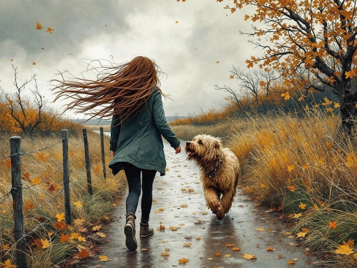 Prompt: A walk with a friend: one woman with long hair, one shaggy dog, both blown about by wind; grey winds, autumn leaves, bare branches, blustery atmosphere; neo-expressionism and pop art
