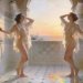 Prompt: A 19th-century Golden Age painting features the fountains of the Palace of Versailles as a backdrop, bathed in the clear light of dawn, where the crystalline water reflects the daylight and the colors of sunrise. Bathed in soft ambient light, the fountains gradually reveal a landscape typical of 16th-century classical France, perfectly suited to the subject. In the painting, two beautiful French women, one tall and slender with white hair, and the other, with red hair, slightly shorter and more voluptuous, wear petticoats and half-open blouses of sheer silk that cling to their wet bodies, bathing joyfully in the fountains. The image is imbued with an ethereal and dreamlike atmosphere, combining warm tones and subtle touches of color that evoke tranquility and creative inspiration. The entire scene, both interior and exterior, evokes a classic Emily Brontë love story.