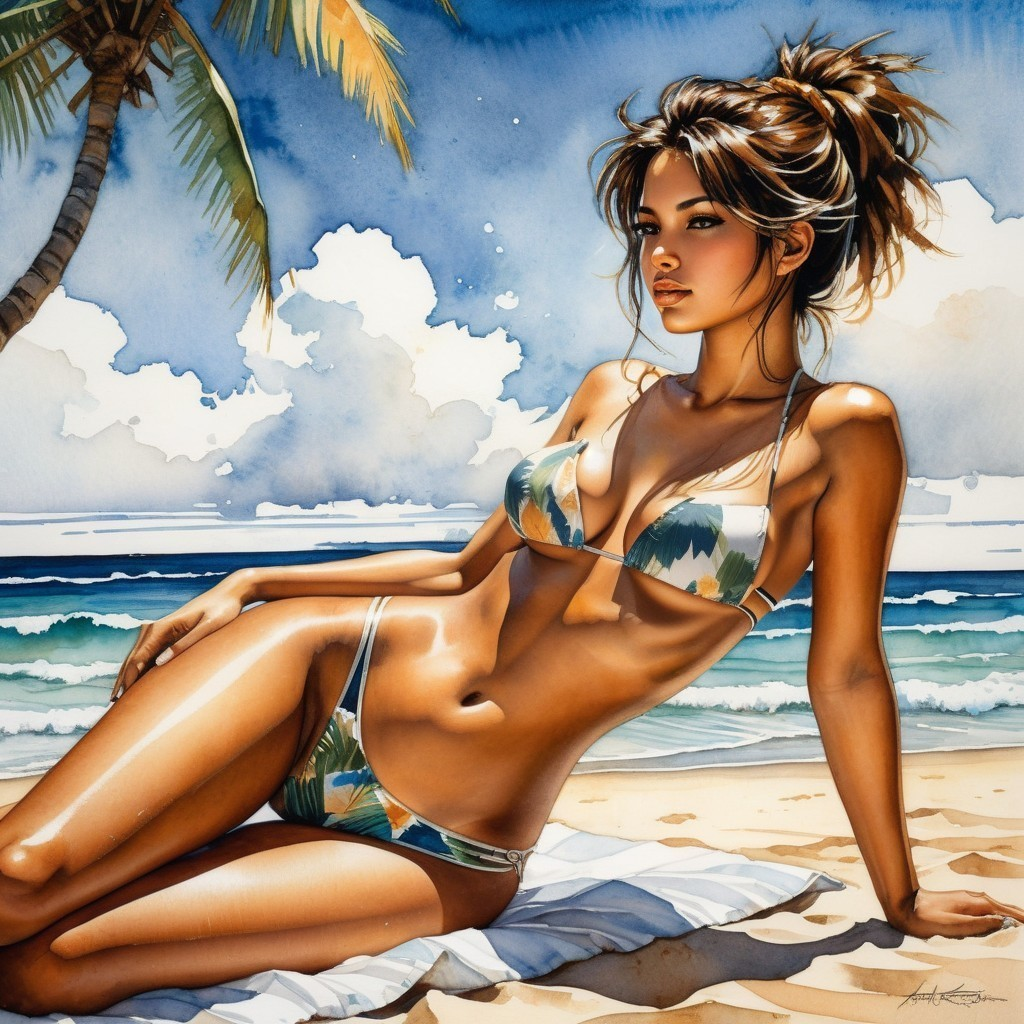 Prompt: A stunning masterpiece in the patchwork style of Albert Robida, Alice Pasquini, Masamune Shirow and Luis Royo. Ultra-realistic watercolor painting of a beautiful girl with a smooth, dark golden brown tan all over her face and body. She has a perfect figure. This portrait features a full body profile view of the girl sunbathing on a tropical beach, wearing a yellow leather bikini. She is enjoying the hot sun shining down strongly on her sun-browned, oiled skin. This artwork combines intricate patterns and rich colors, creating a magical and dreamy atmosphere. The cozy, warm lighting enhances the intricate details, creating a magical example of feminine beauty. This artwork is highly detailed, Ultra-high definition, Ultra-vibrant. An elegant pose.