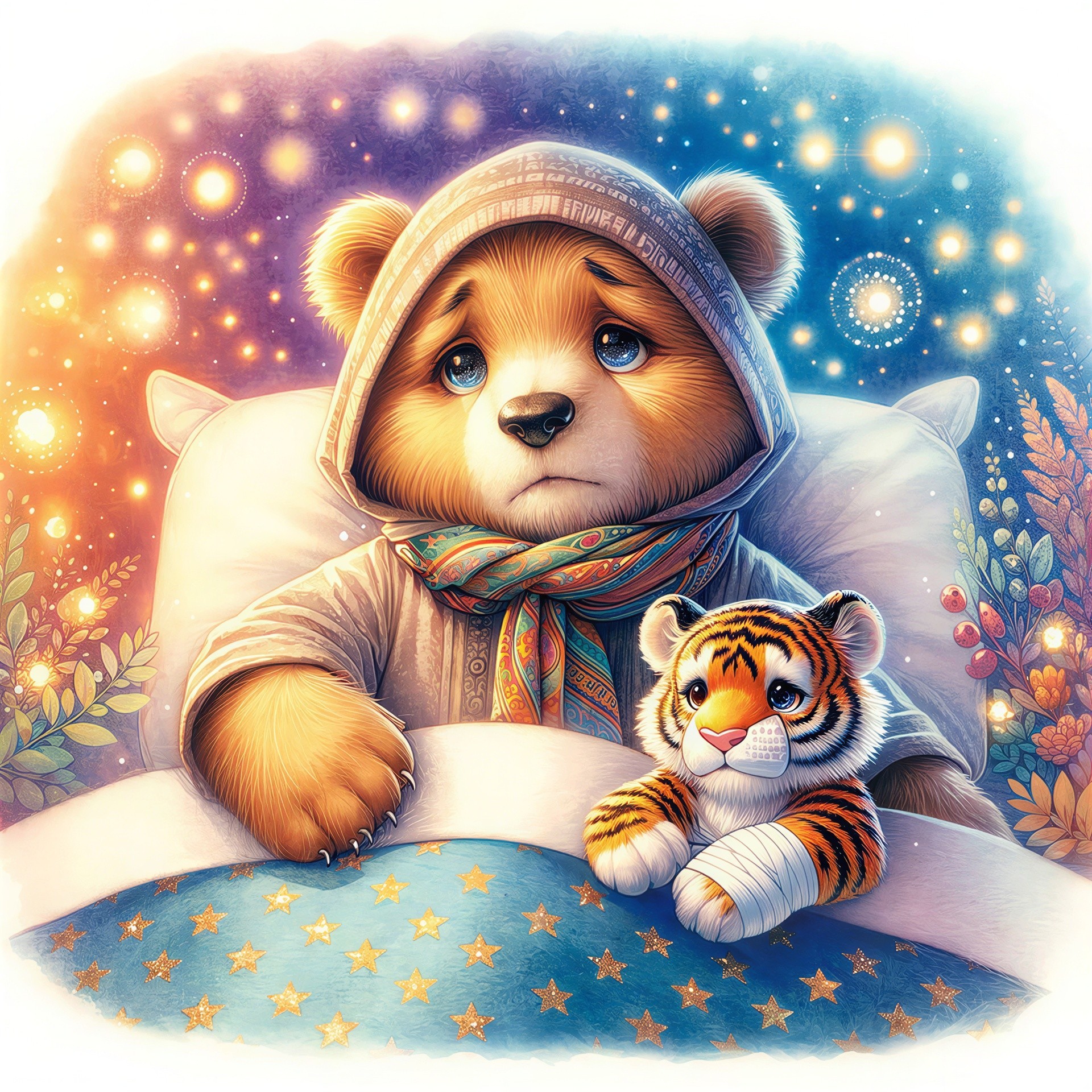 Prompt: A very cute anthropomorphic little bear lies in bed wrapped in warm blankets. The very cute anthropomorphic bear looks very ill and miserable. A very cute anthropomorphic little tiger sits on the bed, one paw wrapped in a bandage. The very cute anthropomorphic little tiger is not very happy. Very soft light, very sweet atmosphere.