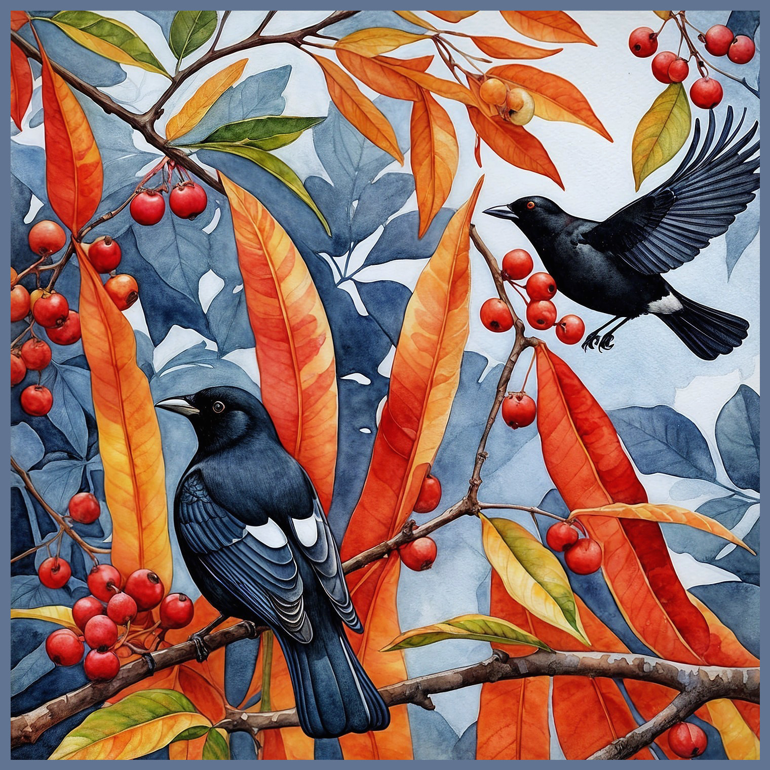 Prompt: A detailed, abstract watercolor and ink painting depicting a spray of berries and leaves of the American Mountain Ash with a blackbird perched on it. In a patchwork of styles of Matisse, William Morris, Daniel Merriam, hyper-detailed, sharp focus, intricate concept art, digital painting, ambient lighting, HDR trending on artstation.