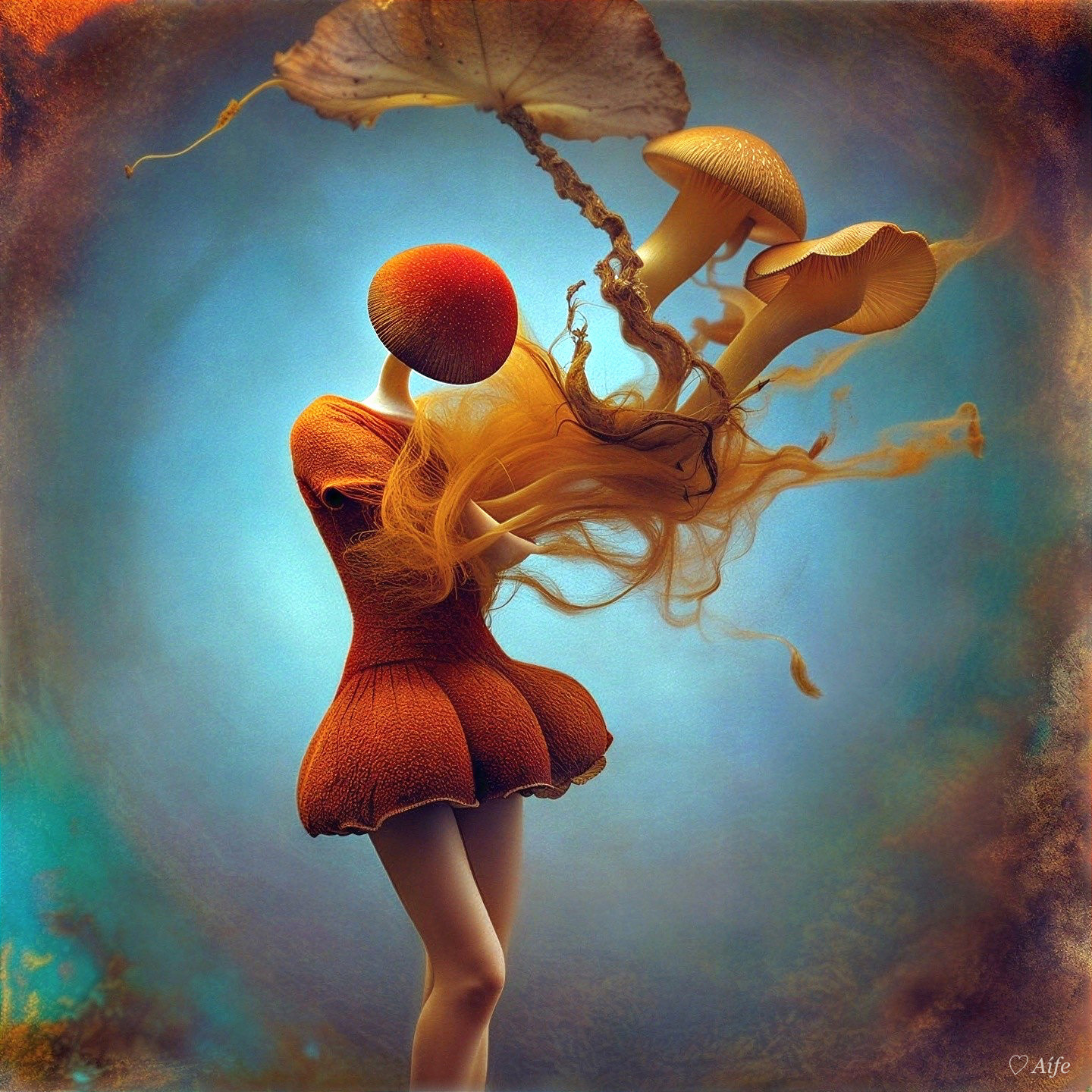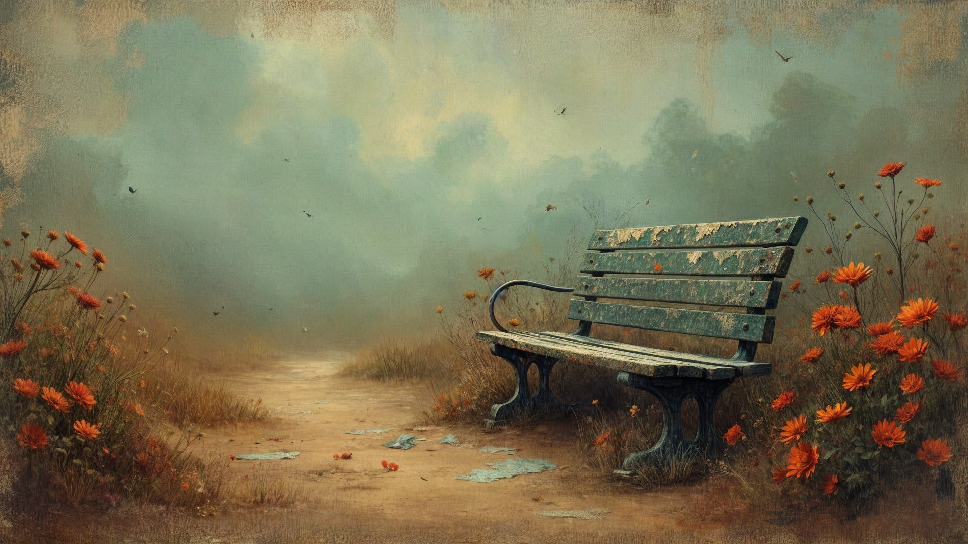 Prompt: Create a folk art, hand painted antique canvas of a mysterious blurry cinematic photo featuring peeling paint on an old park bench where no one comes to sit, but still the flowers bloom all around on a hazy, lazy summer day. A moody backdrop with a few dark clouds and drifting dust creates an atmosphere of mysterious enchantment with fine detailed structures with uncertain textures, fine color scratches, tears, cracks in the paint a the style comparable to that of Gabriel Pacheco. Antique extreme canvas textured. Colors of, brown, tan, desert orange, faded yellow, soft green and pale blue sky shift into each other like sandy mist.