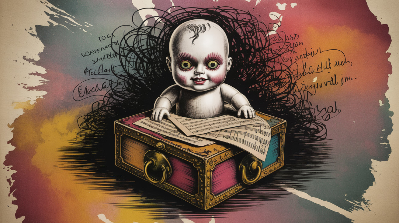 Prompt: exquisite handcolored steel engraving captures. "Rock 'n Roll's Evil Doll" explosive contrast of brilliant colors. magical strokes, insanely detailed textures, complicated background, disturbing, scribbling. magical whimsical world. after Paul Gauguin. after Jacek Yerka. after Catrin Welz-Stein. black and gold, background in graphic and watercolor vintage style.