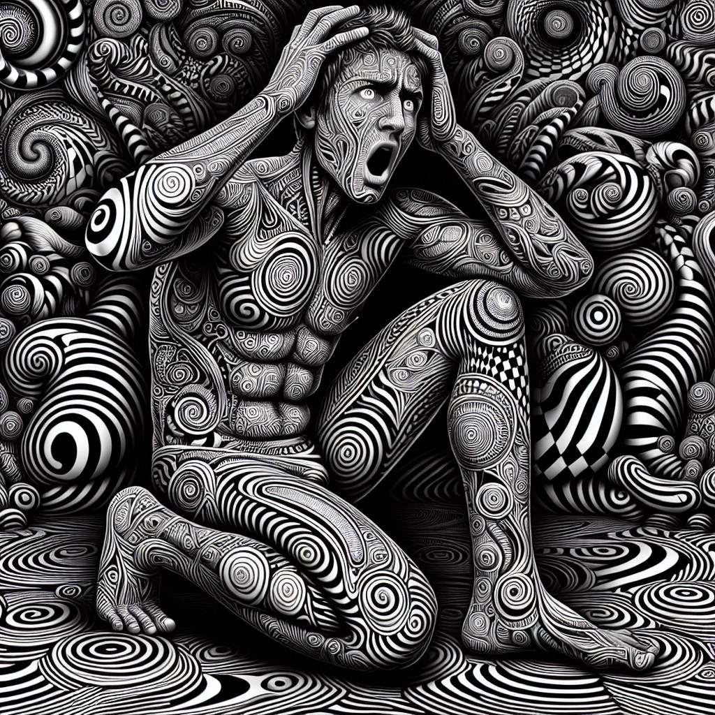 Prompt: Create an intricate black and white psychedelic background with swirling, twisting patterns of varying textures, including spirals, waves, and abstract geometric shapes that form a maze-like environment. In the center, depict a person in a crouching position with knees bent, elbows on thighs, and hands clutching the sides of their head. The person should have an expression of shock or horror with their mouth wide open as if screaming. The individual should have skin covered in a vivid rainbow-colored pattern consisting of concentric circles and swirling designs that resemble body paint or tattoos. The clothing should match this pattern, giving the appearance that the person is seamless with the colorful design. Make the eyes wide with visible whites and the hair concealed or conforming to the pattern on the skin, thereby not detracting from the cohesive patterned aesthetic. The artwork should have a surreal, otherworldly feel with a high level of detail and visual complexity. she happy and smile.