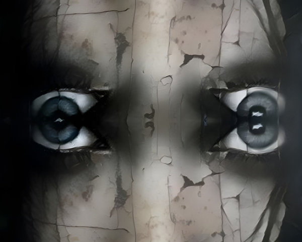 Prompt: A close-up abstract portrait emphasizing a single expressive hybrid robot human eye, features layered textures and fragmented elements, blending black, gold, and earthy brown tones composition. distressed background, industrial feel with vertical streaks and metallic accents, creates depth and contrast. mysterious and evocative atmosphere, blended modern abstract art with a touch of surrealism.