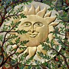 Prompt: 3D, oil on canvas, a loud laughing yellow sun with cheerful eyes, uncrowned by sunbeams made of fire looks out from behind bushes, all around colorful flowers and leaves, inspired by Yana Movchan